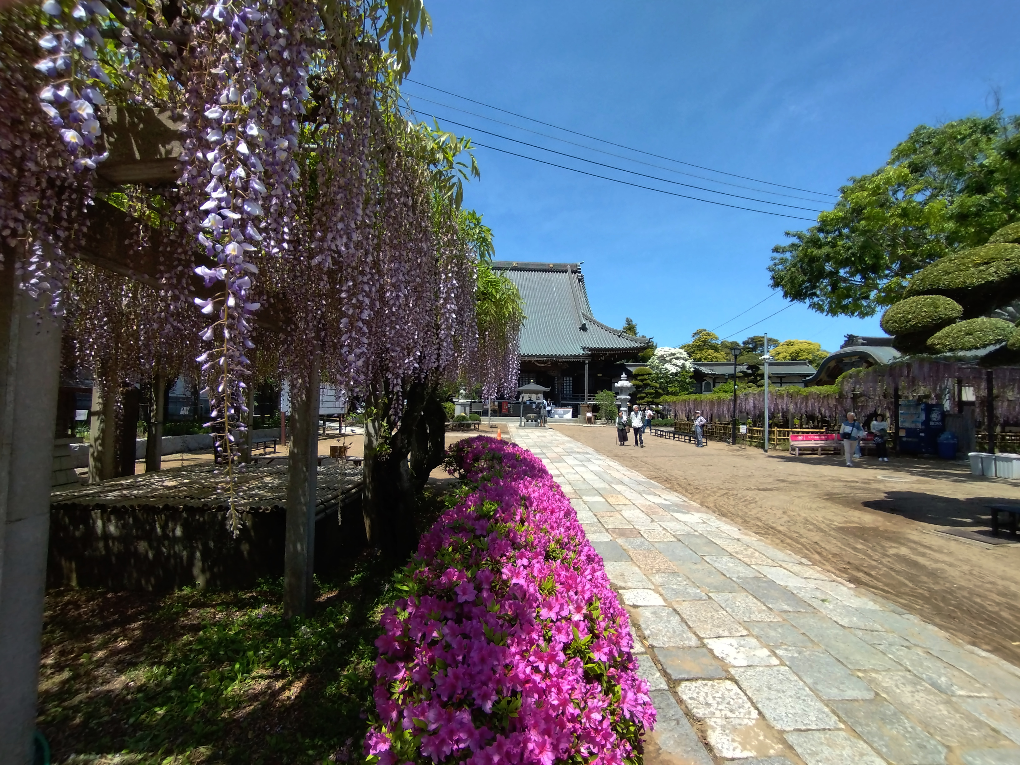 匝瑳 銚子は車で行くのに大変です。 銚子は、高速が繋がっていないので同じ千葉県でも木更津から片道120kmもあります。千葉県に藤の名所があるのは知りませんでした。匝瑳市木積地区に数百本を数える藤の花々が咲いているそうです。 今回は、龍頭寺の樹齢100年の大藤を見ました。観光客がいないので藤の写真は、撮りやすいです。藤棚の下に入れるので綺麗に撮れます。