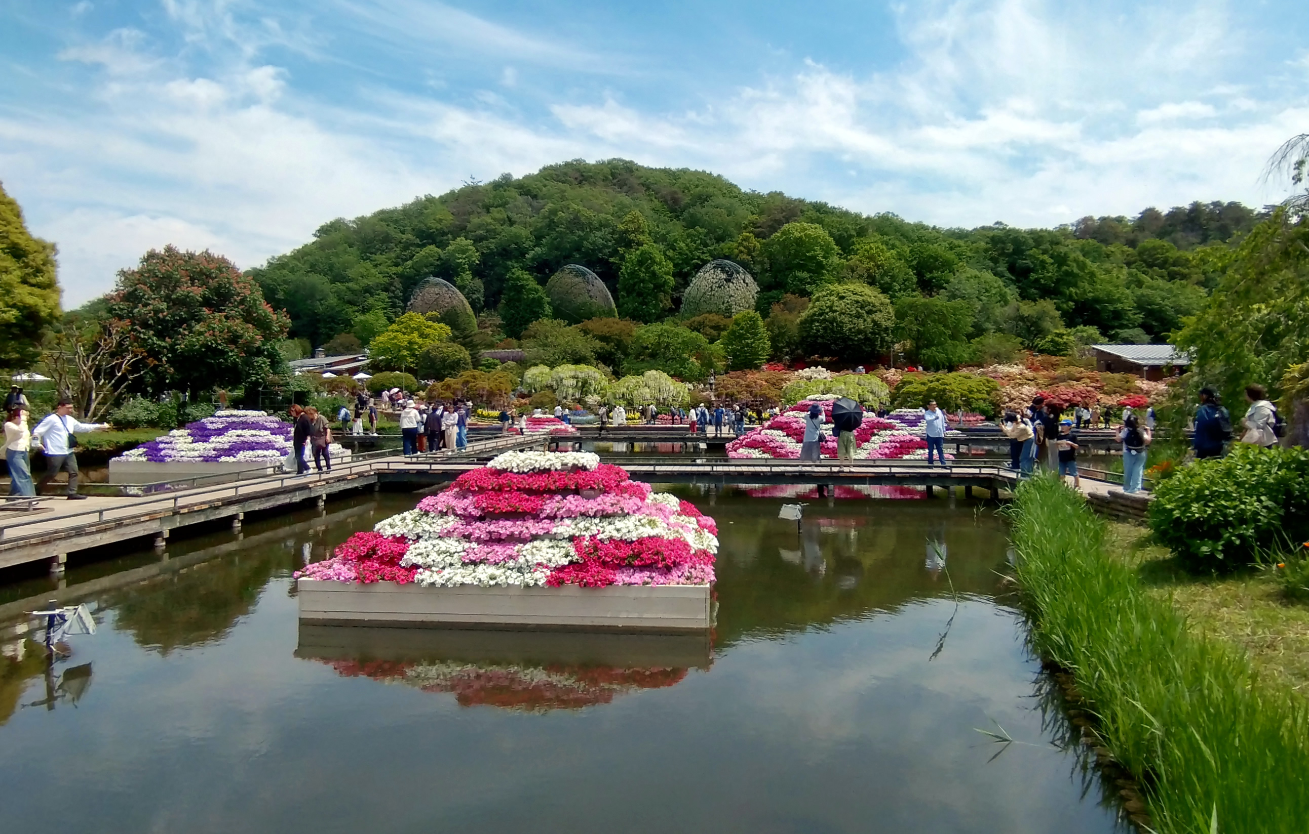園内の池の周囲には色とりどりのペチュニアを使った立体的なピラミッド状の花壇が設置されています。紫や白、ピンクなどのペチュニアが美しく積み重ねられ、池の水面に映る姿も幻想的です。