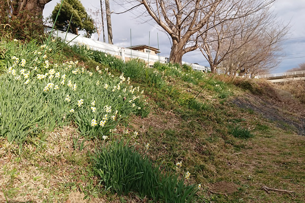 木更津の矢那川水仙がちらほら咲き誇ります。 矢那川は、枯草が多く枯草の中に水仙が咲いているような感じです。