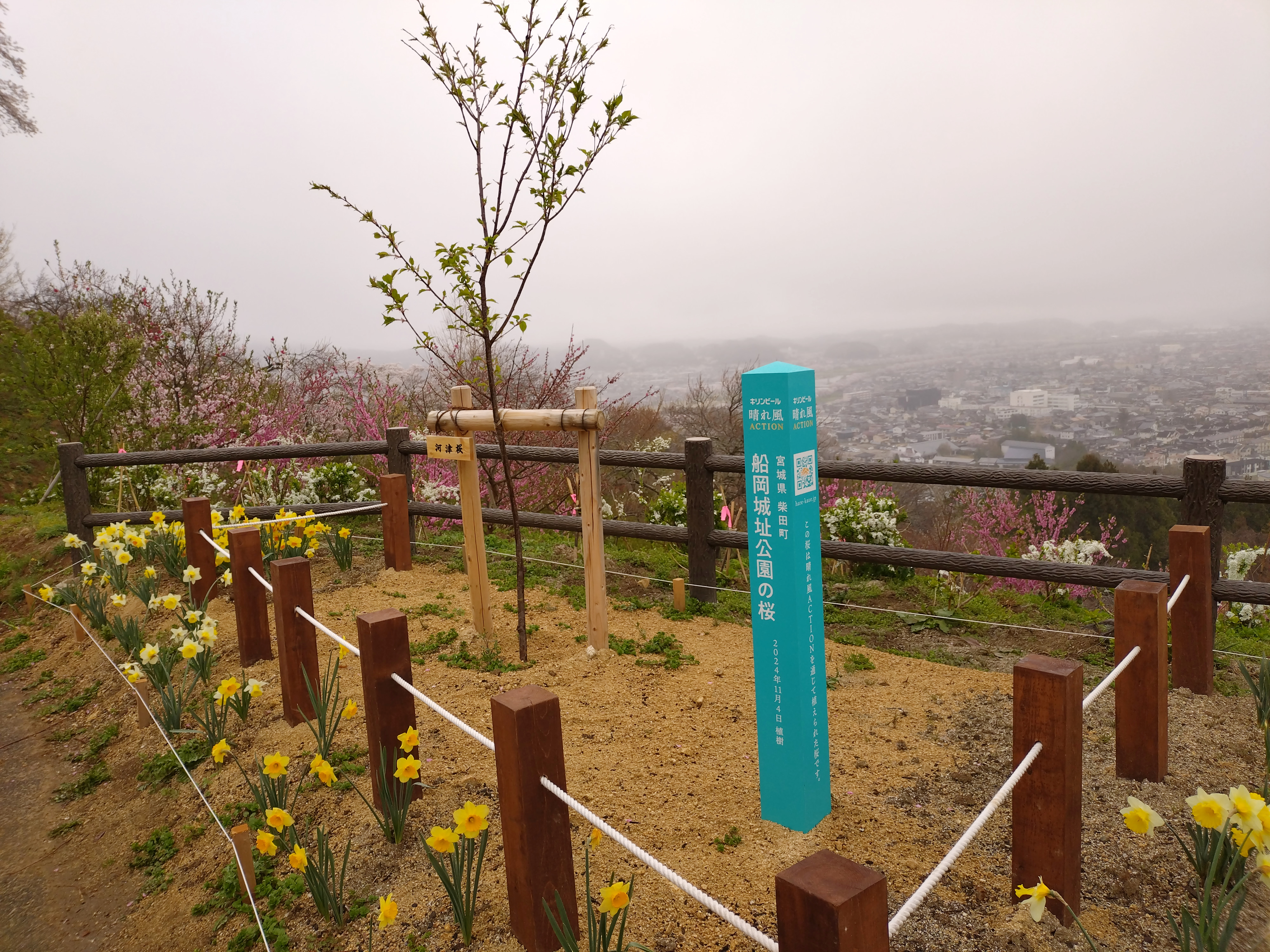 本寄付は船岡城址公園と白石川堤の桜樹に対して、新たな桜の植樹や枯れ枝等の剪定、病害虫の駆除に使用する予定です。今年度は船岡城址公園の早春の丘エリアへのカワヅザクラの植樹 船岡城址公園 山頂付近に植えてあります。CMにも植樹シーンが使われていますね。