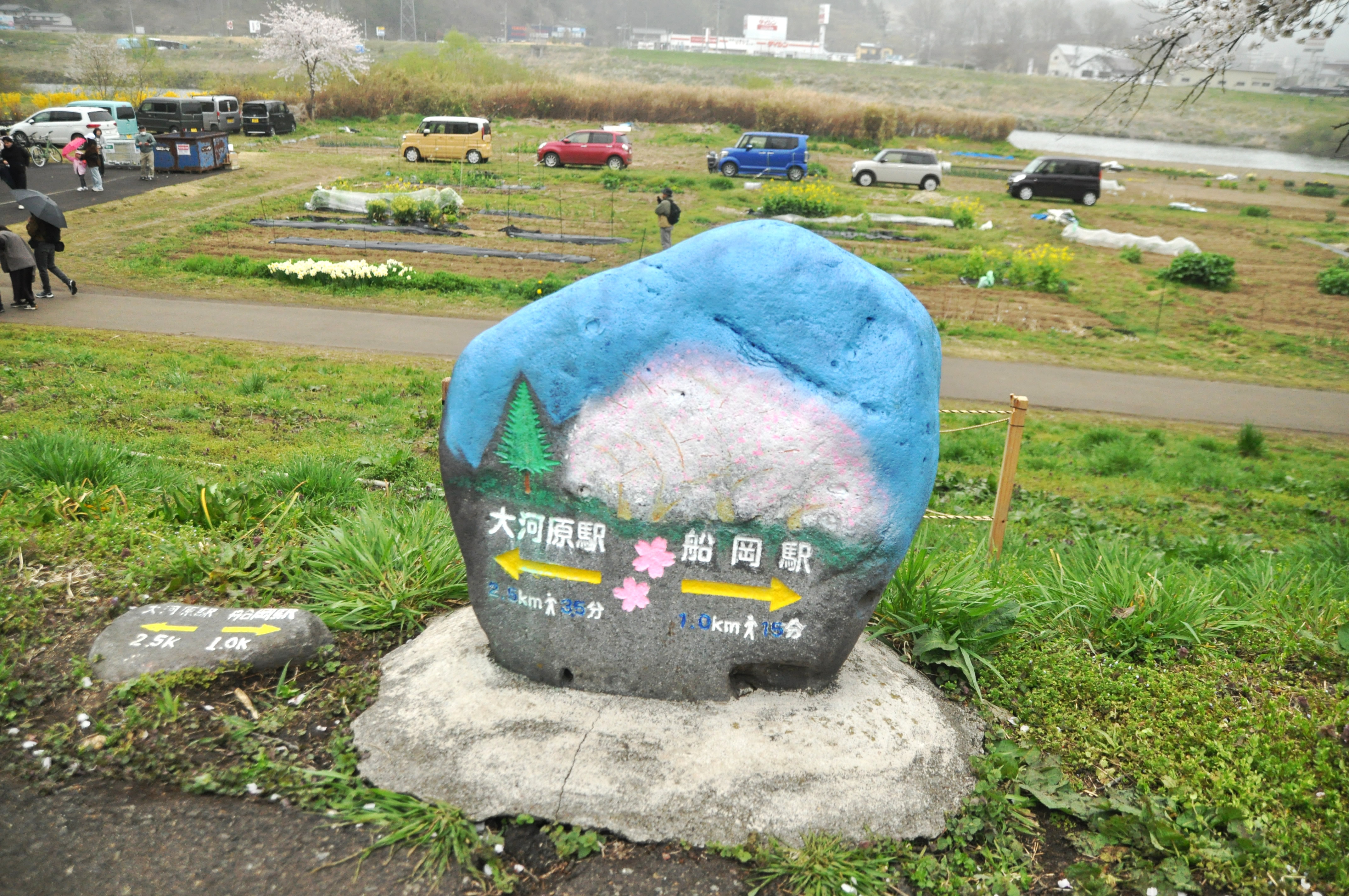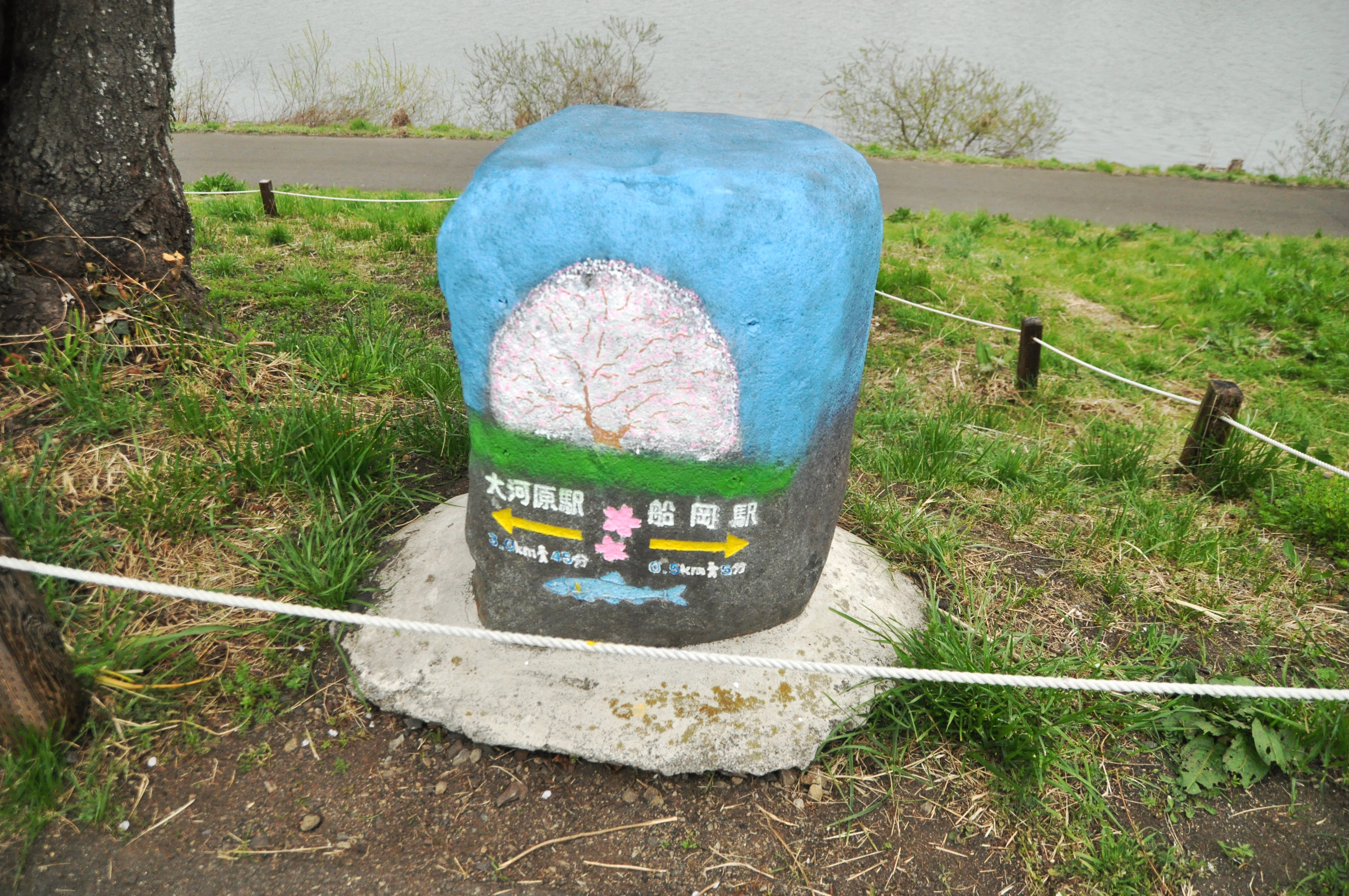 石に書かれた桜の絵と駅までの時間と道のり