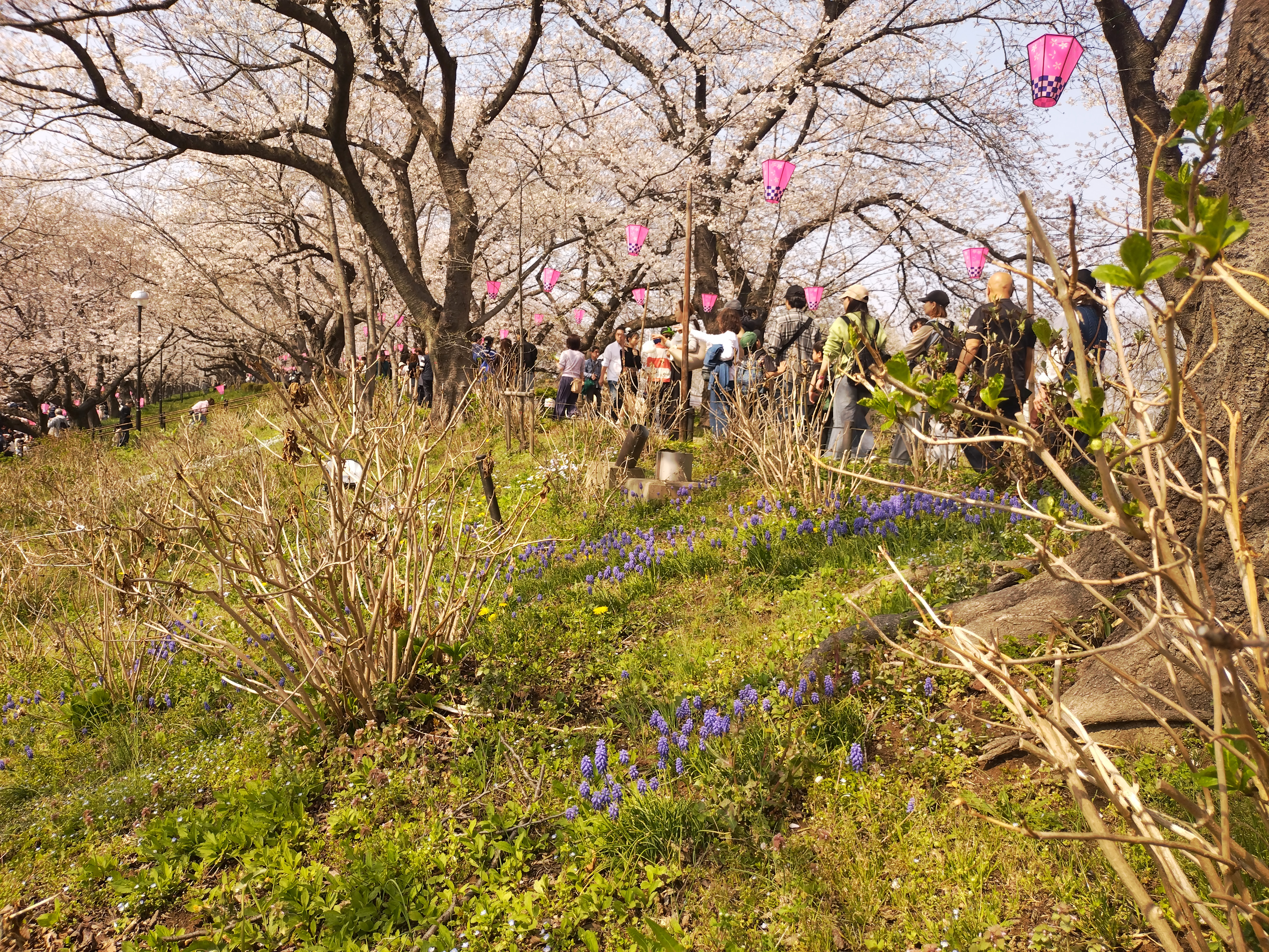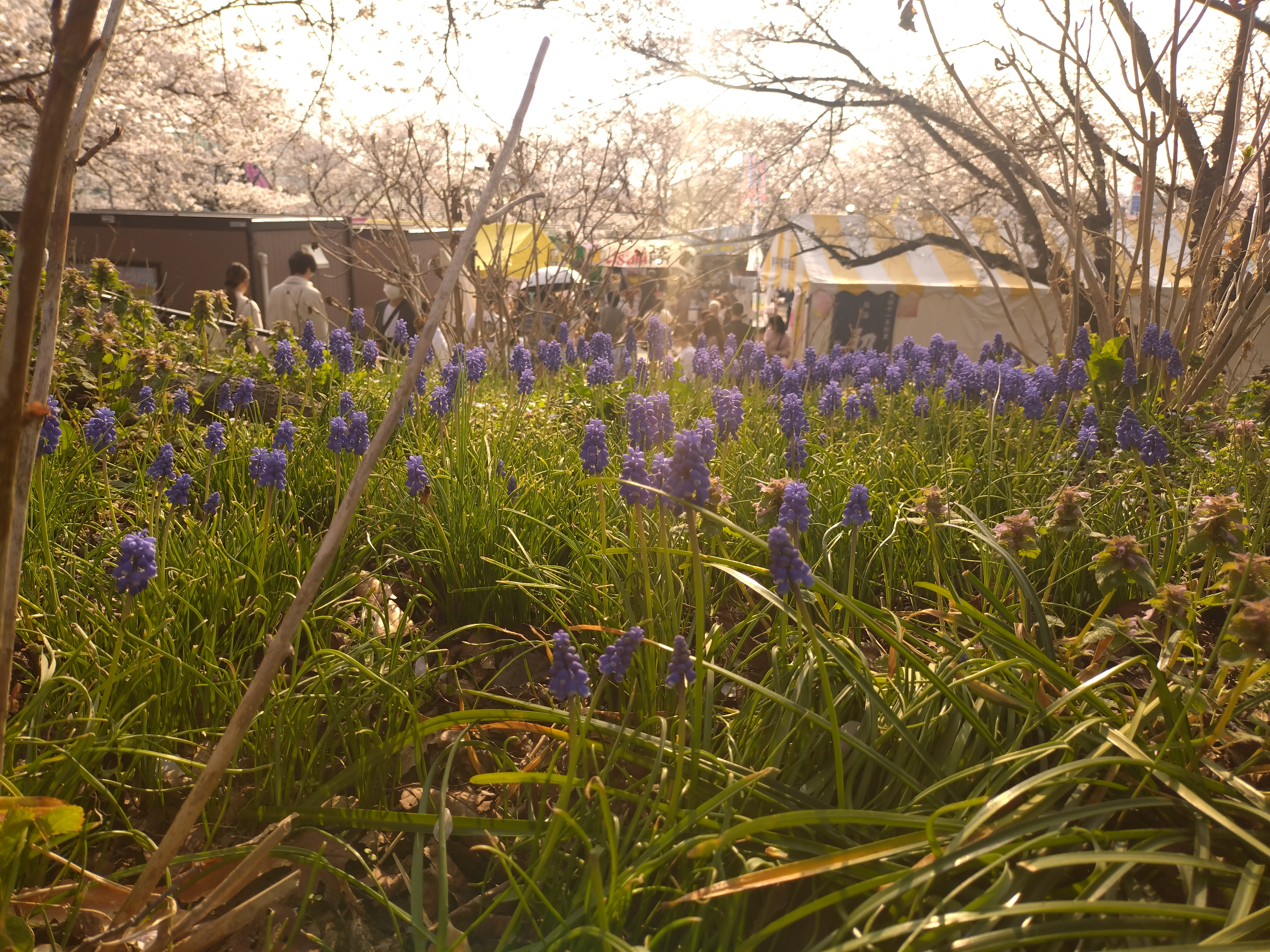 やわらかなピンクの桜と、鮮やかな青のムスカリの組み合わせはとても美しく、春らしいやさしいコントラストを楽しめます。