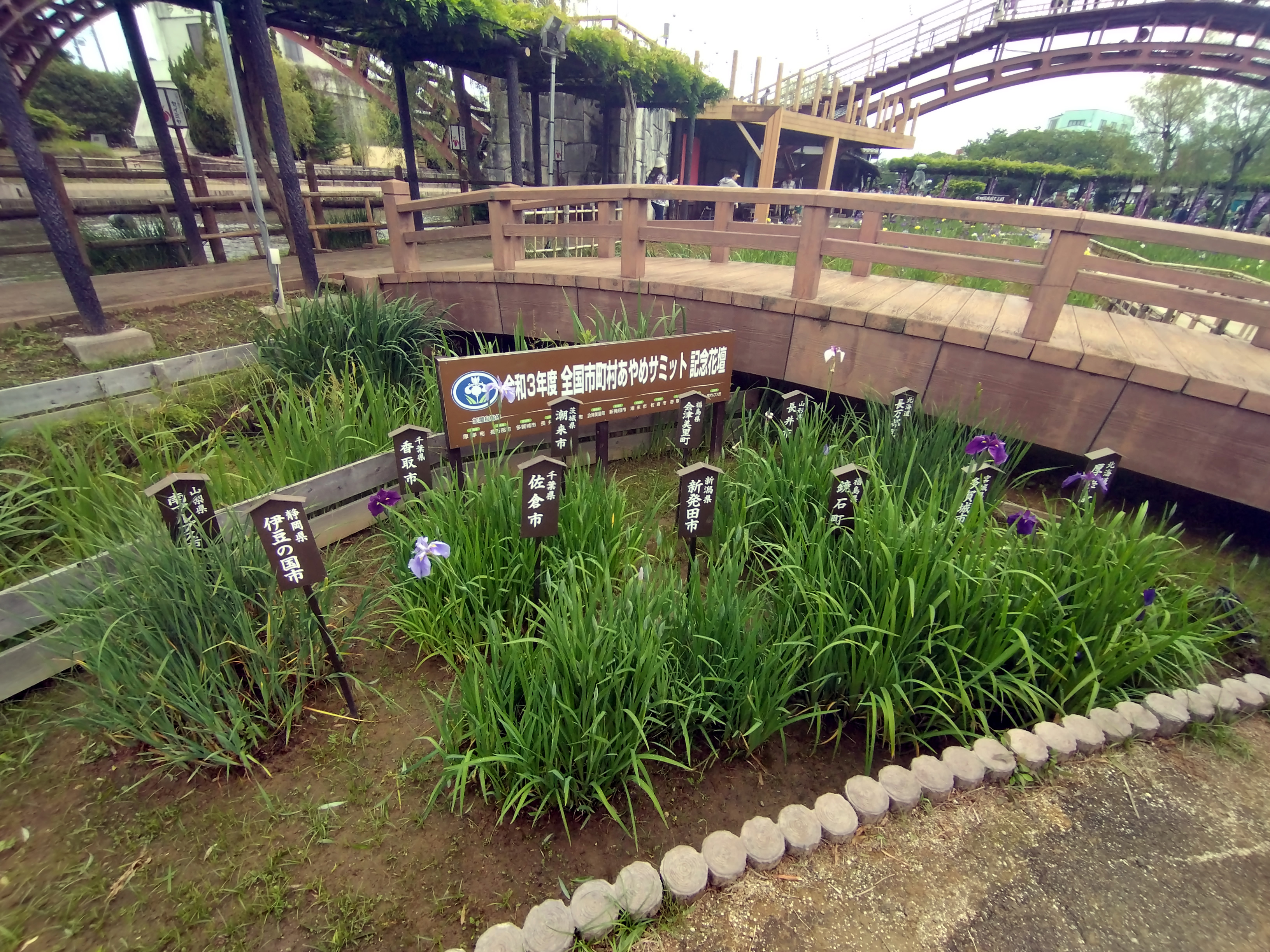 令和3年(2021年)における「潮来市での全国市町村あやめサミット」は、新型コロナウイルスの影響でリアル開催ではなくオンライン(リモート)での首長会議として行われました。全国市町村のあやめが植えられています。