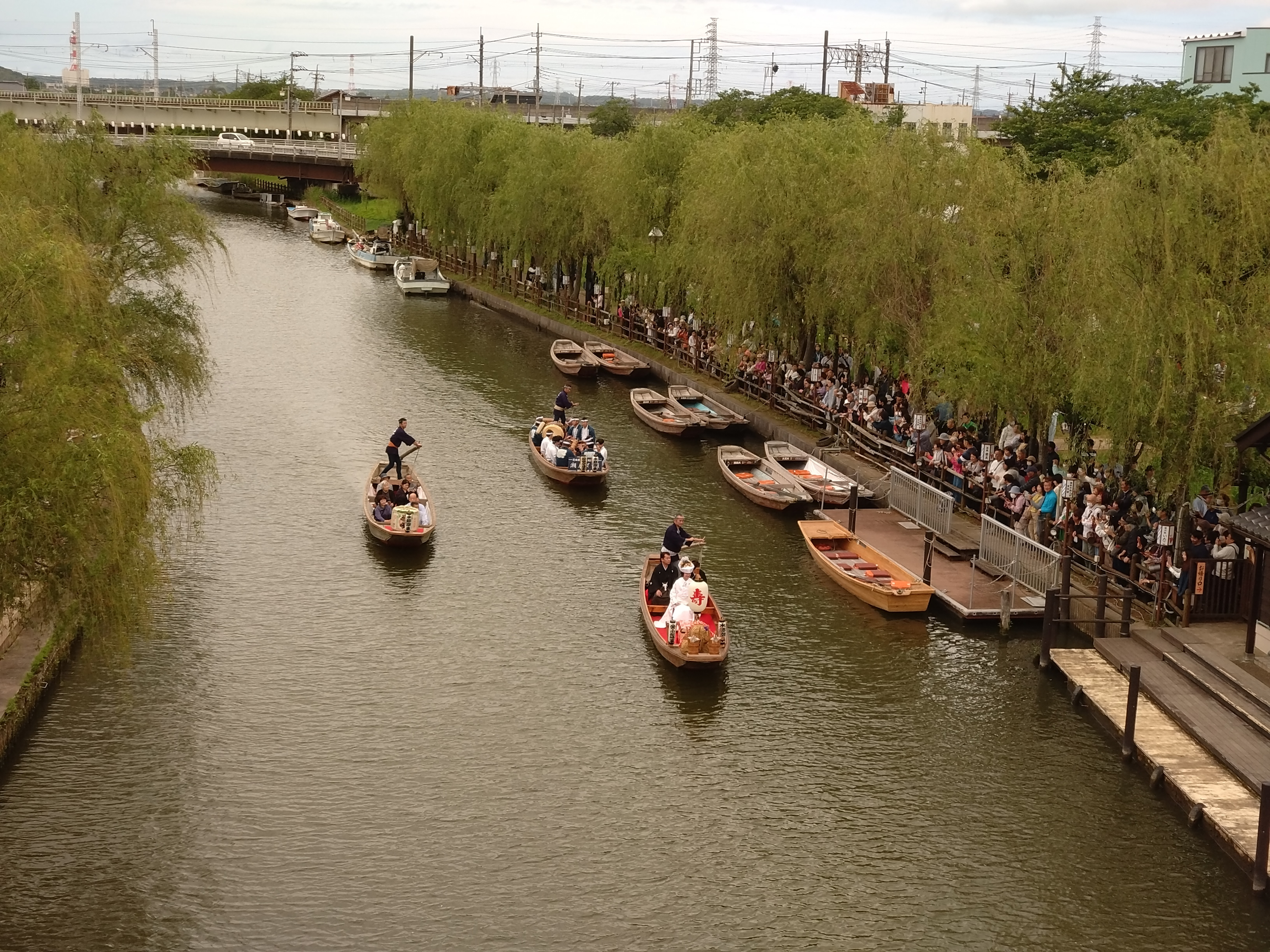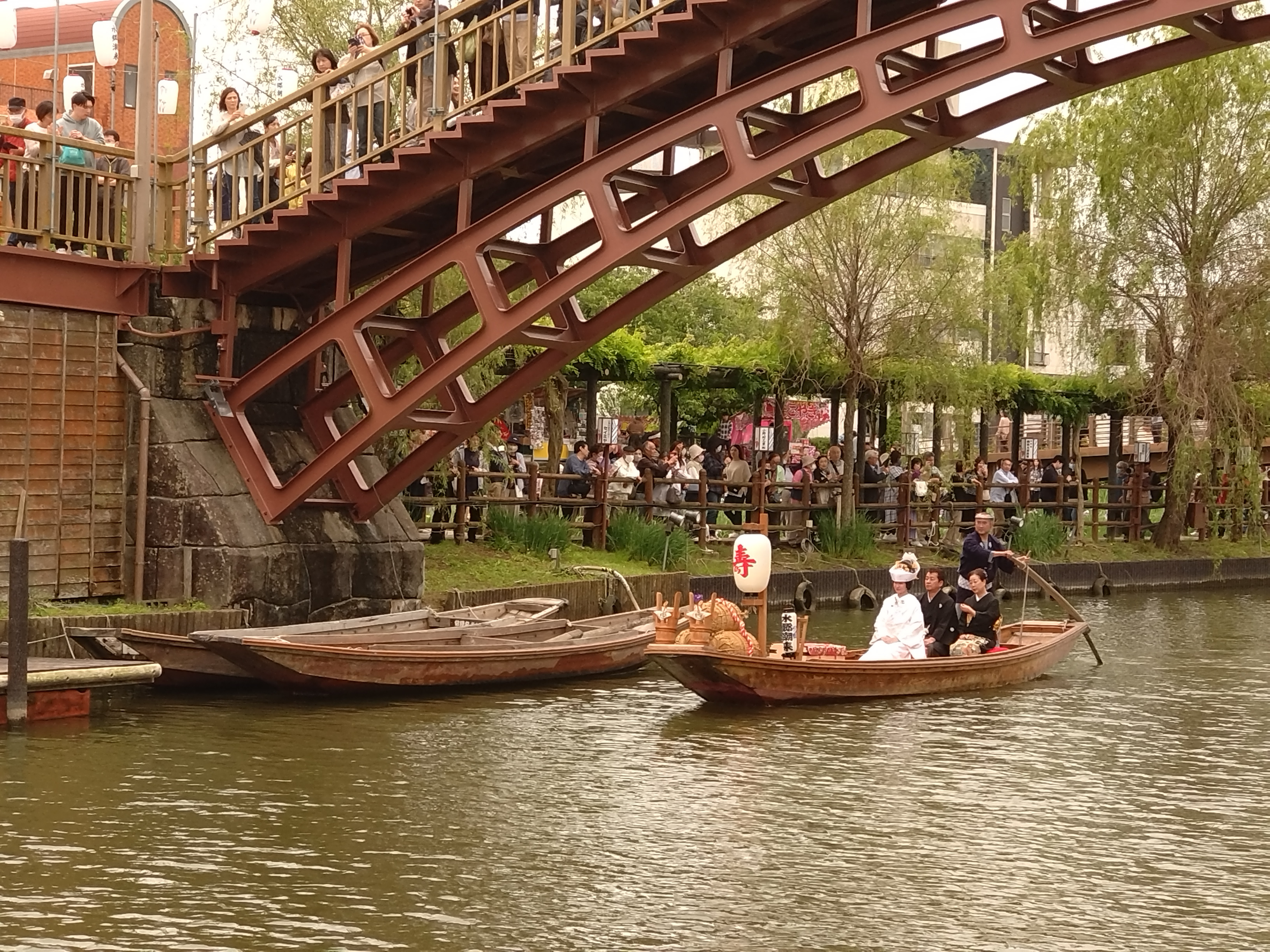 潮来あやめまつり名物のひとつ、「嫁入り舟」での白無垢姿の花嫁が舟でゆっくり進む様子が見られます。