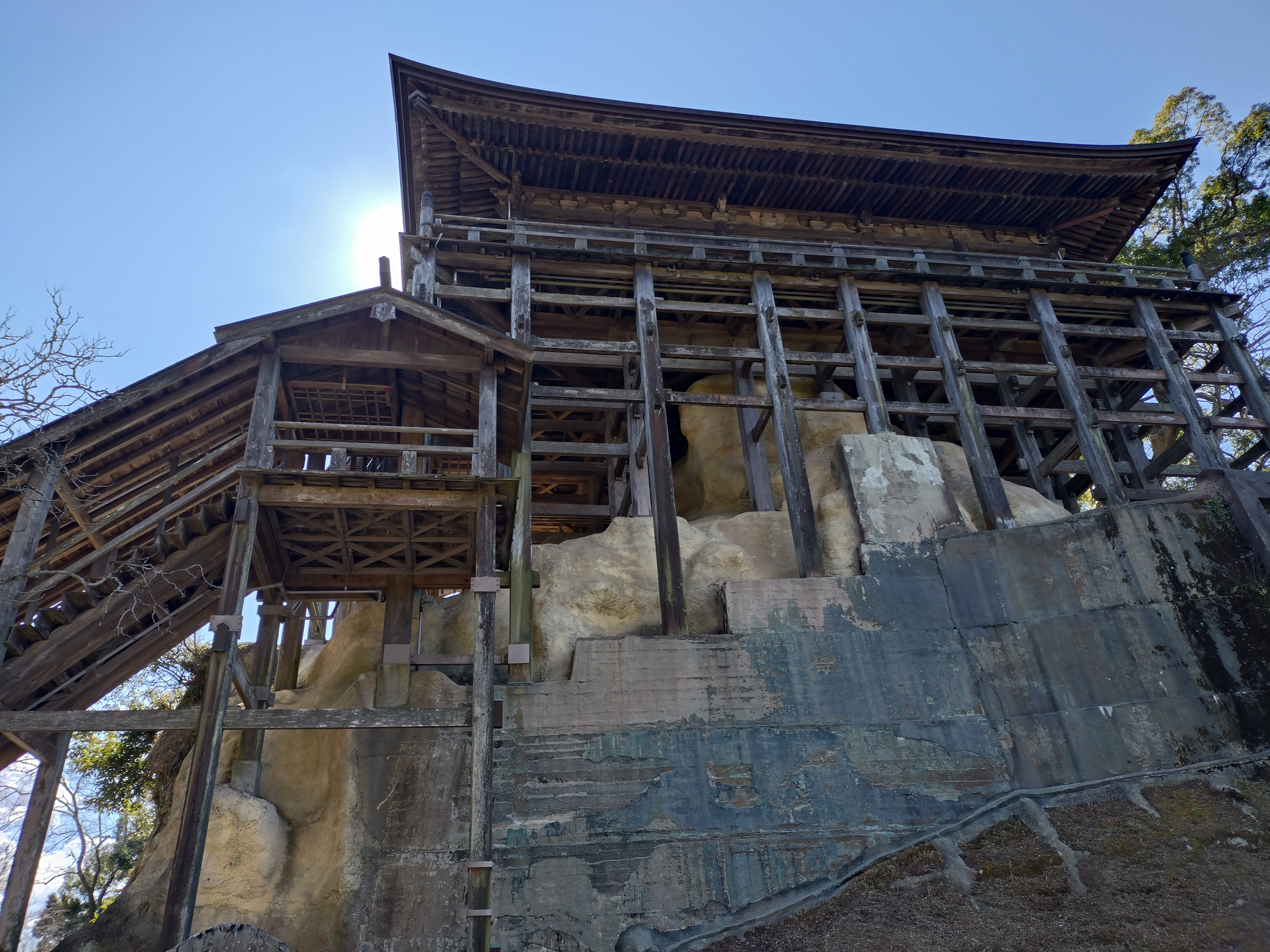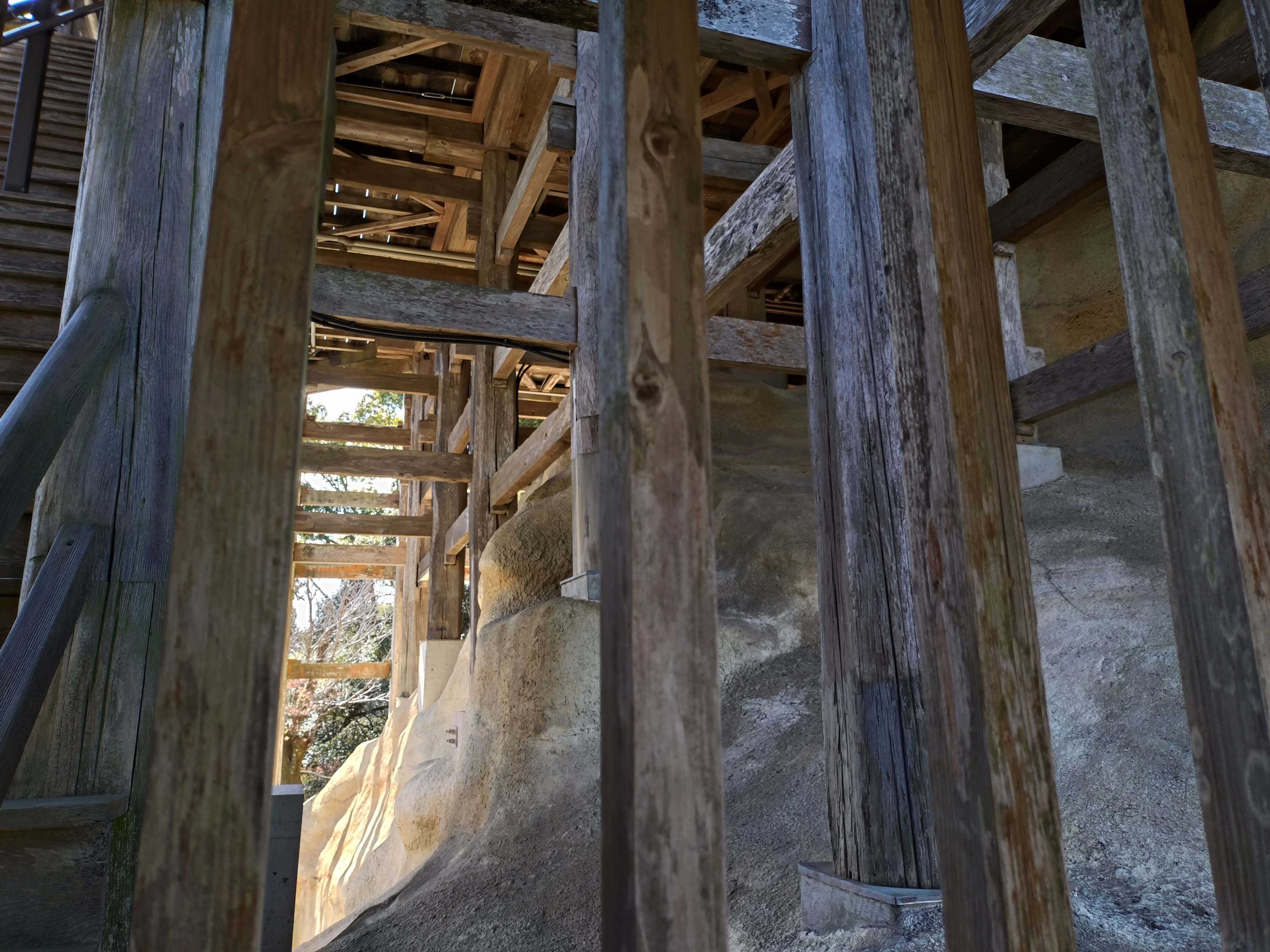岩の上に建っているとわかります。 大きな岩だとわかります。岩に柱がかけられていますがよく安定できるなと感心します。「日本でただひとつ『四方懸造り』として、明治41年(1908年)に『国宝』に、その後、昭和25年(1950年)『文化財保護法』の制定により、『国指定重要文化財』となっています。」
