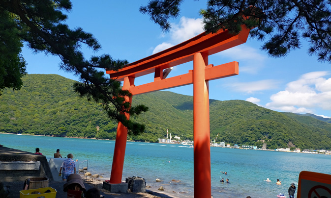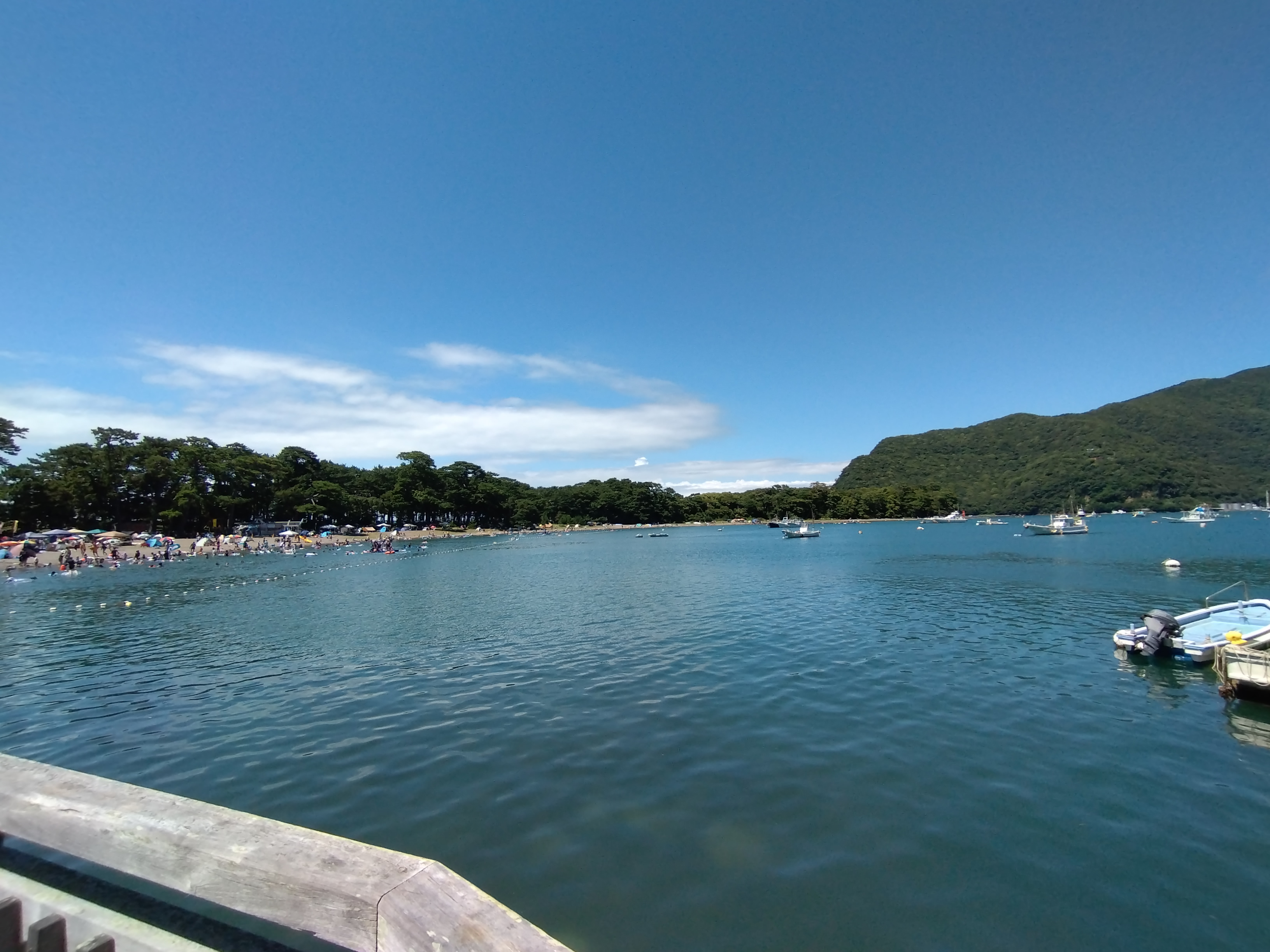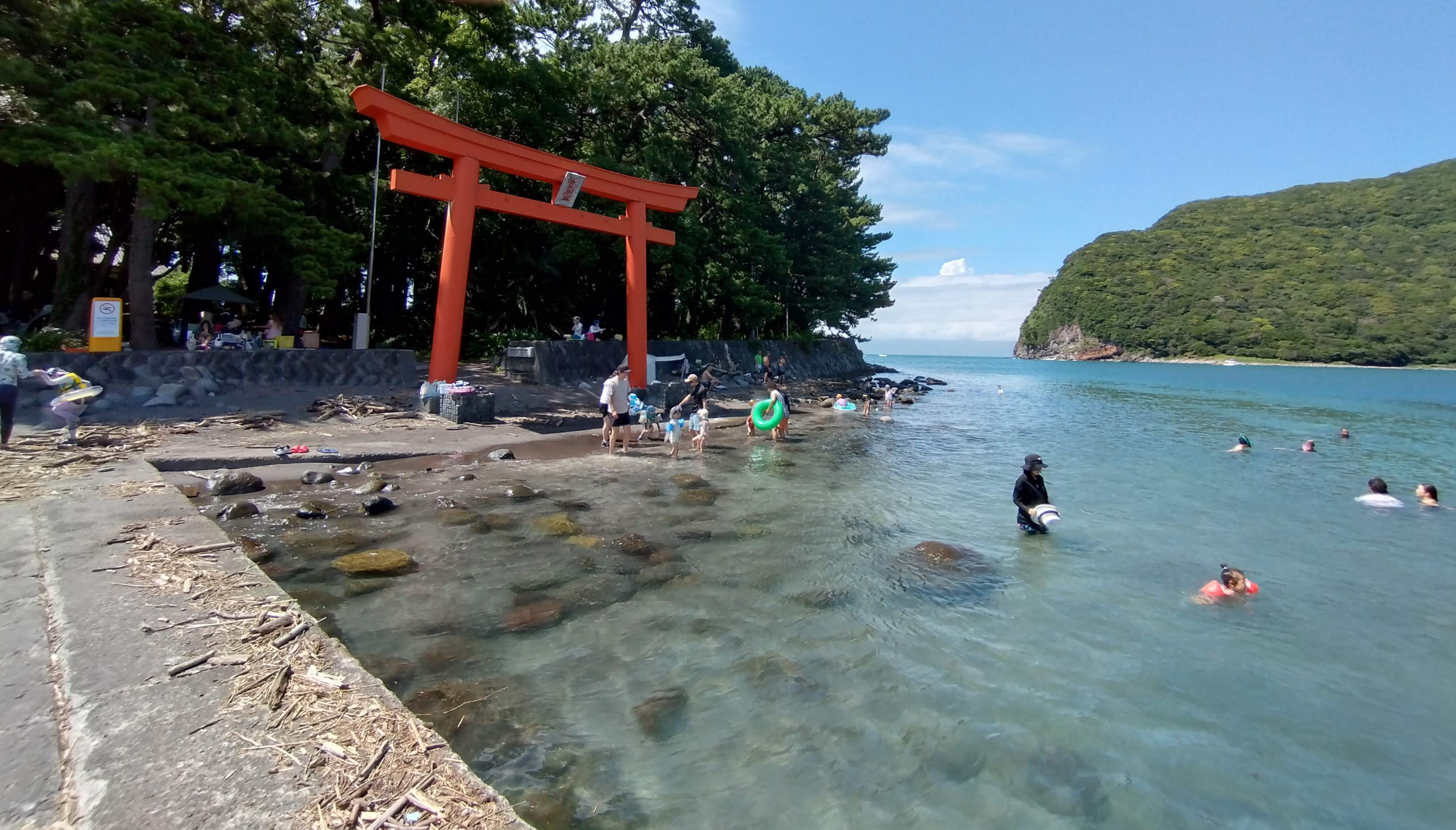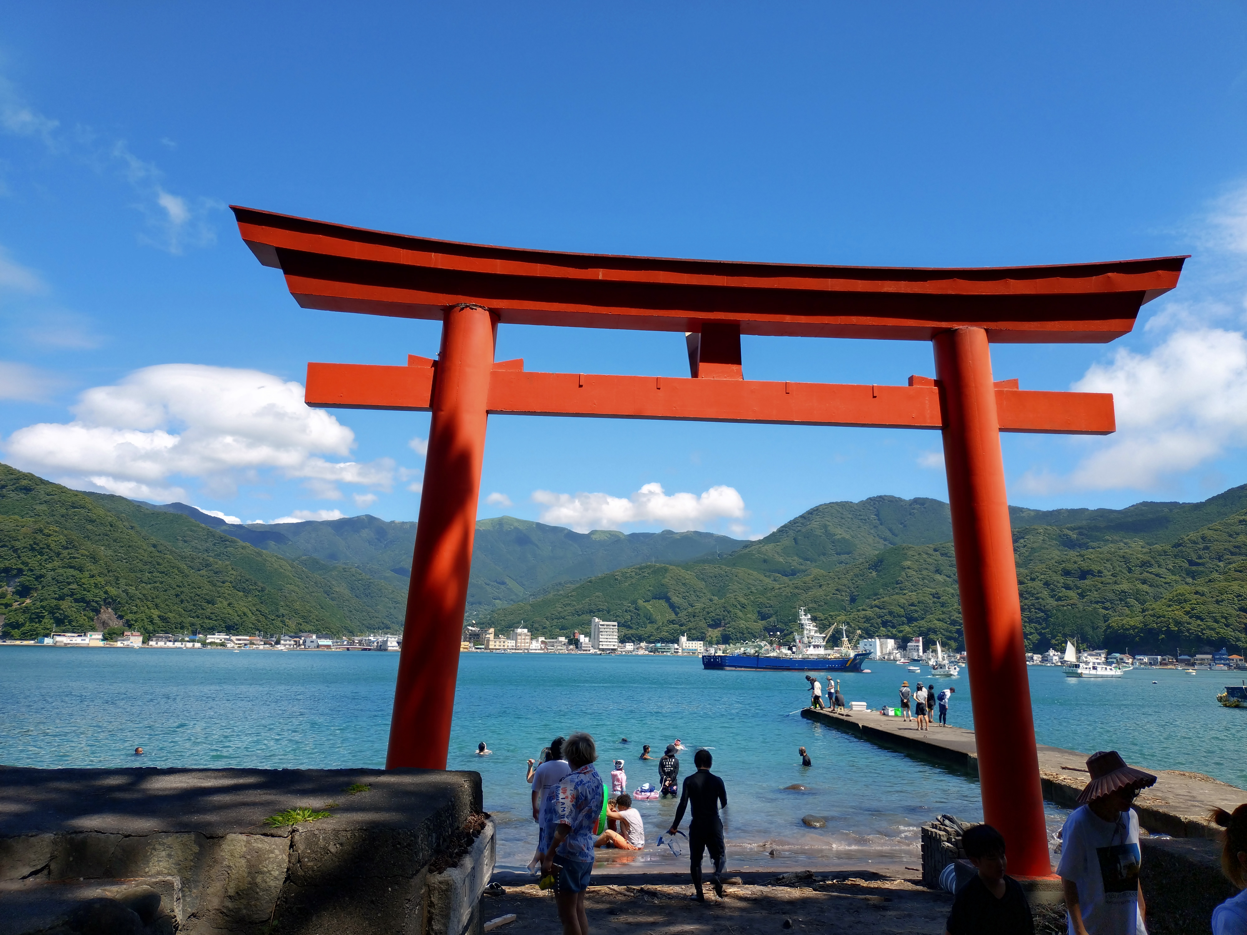 3連休の中日といううことで車が多く2時間位掛かりました。 車で山登りの時間が長いので疲れます。 西伊豆は、電車が通れない理由がわかります。御浜岬の駐車場は、満車で戸田港近くのスーパーの駐車場から停めて2km歩くことにしました。 戸田港から海の水の色が綺麗です。 御浜岬の海水浴客がすごい多く驚きました。 波がなく穏やかなので子供向きの海水浴ですね。御浜岬のメインの鳥居と海は、インスタ映えがすごいします。人が多くどうしても人が映ってしまいますが。エメラルドグリーンの海と鳥居が映えます。東京から片道5時間かかりましたが納得の景色です。次回行くときは出会い岬から御浜岬を見たいと思いました。