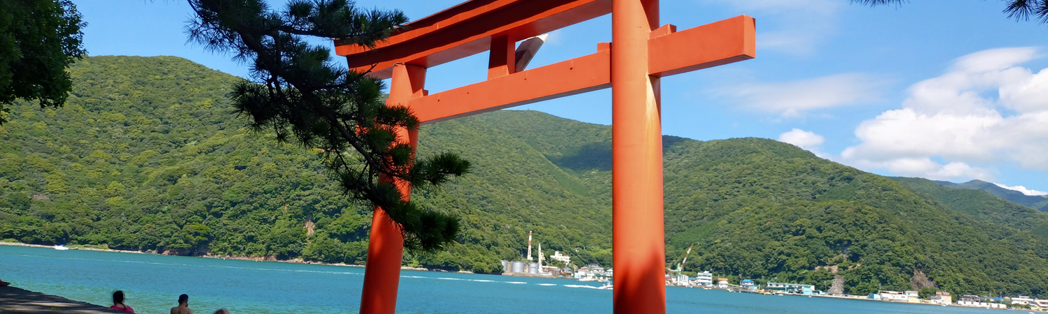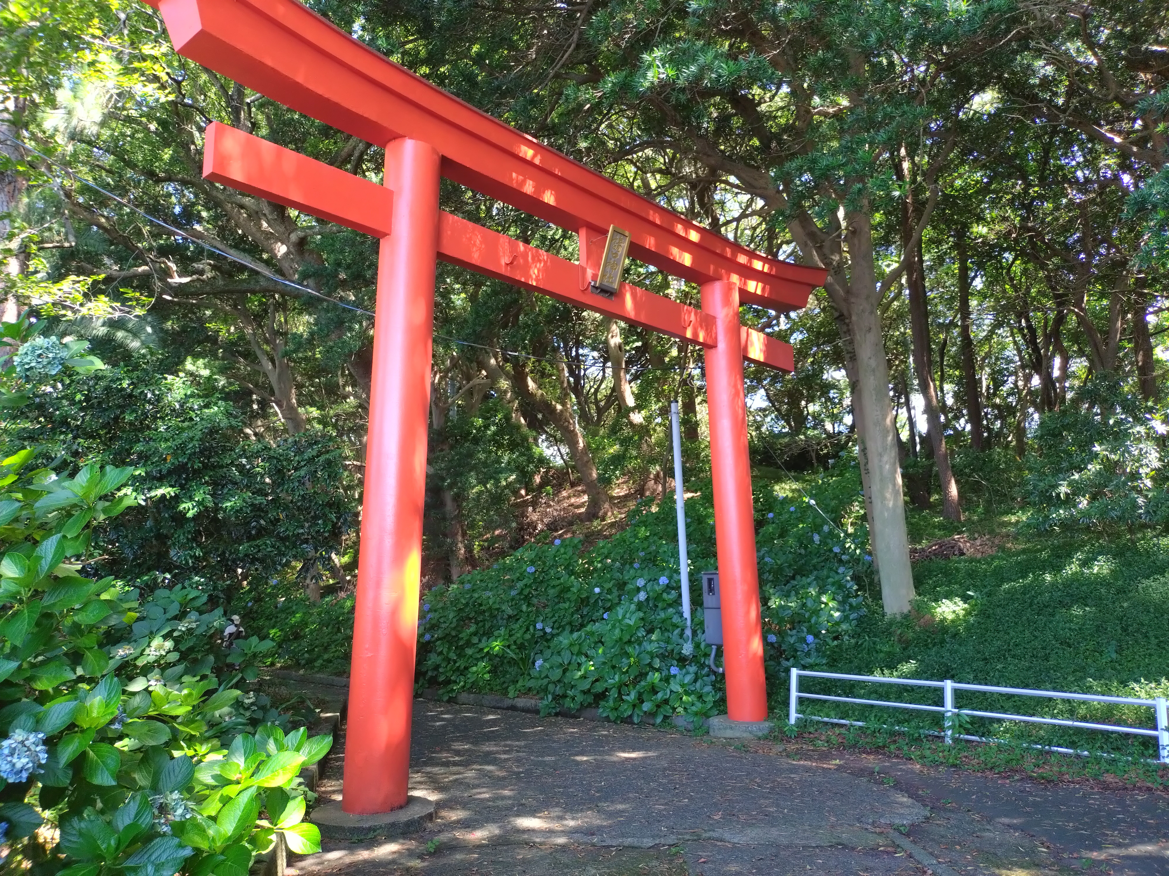 御浜岬の青い海と空を背景に立つ鳥居が印象的なパワースポット。