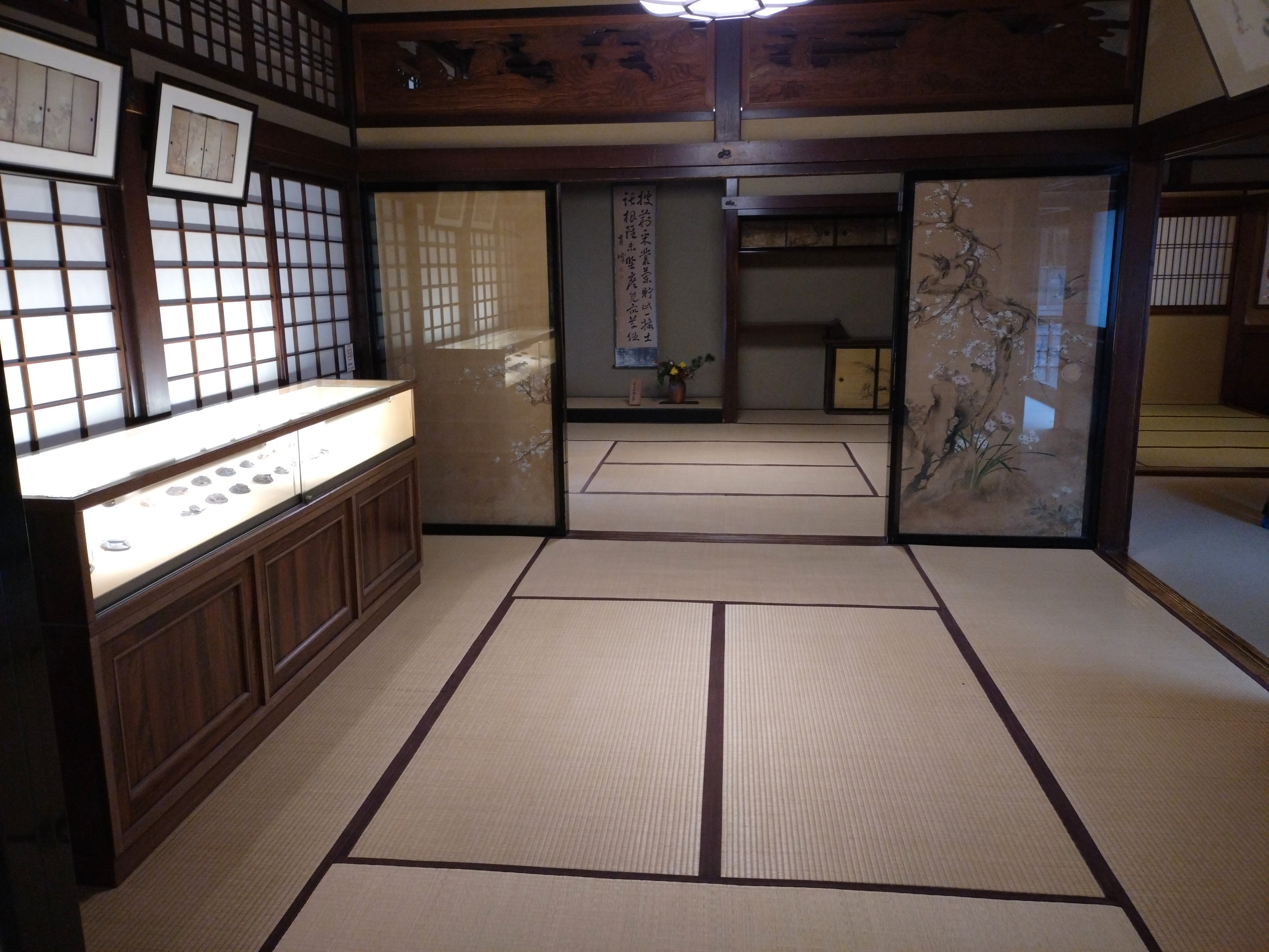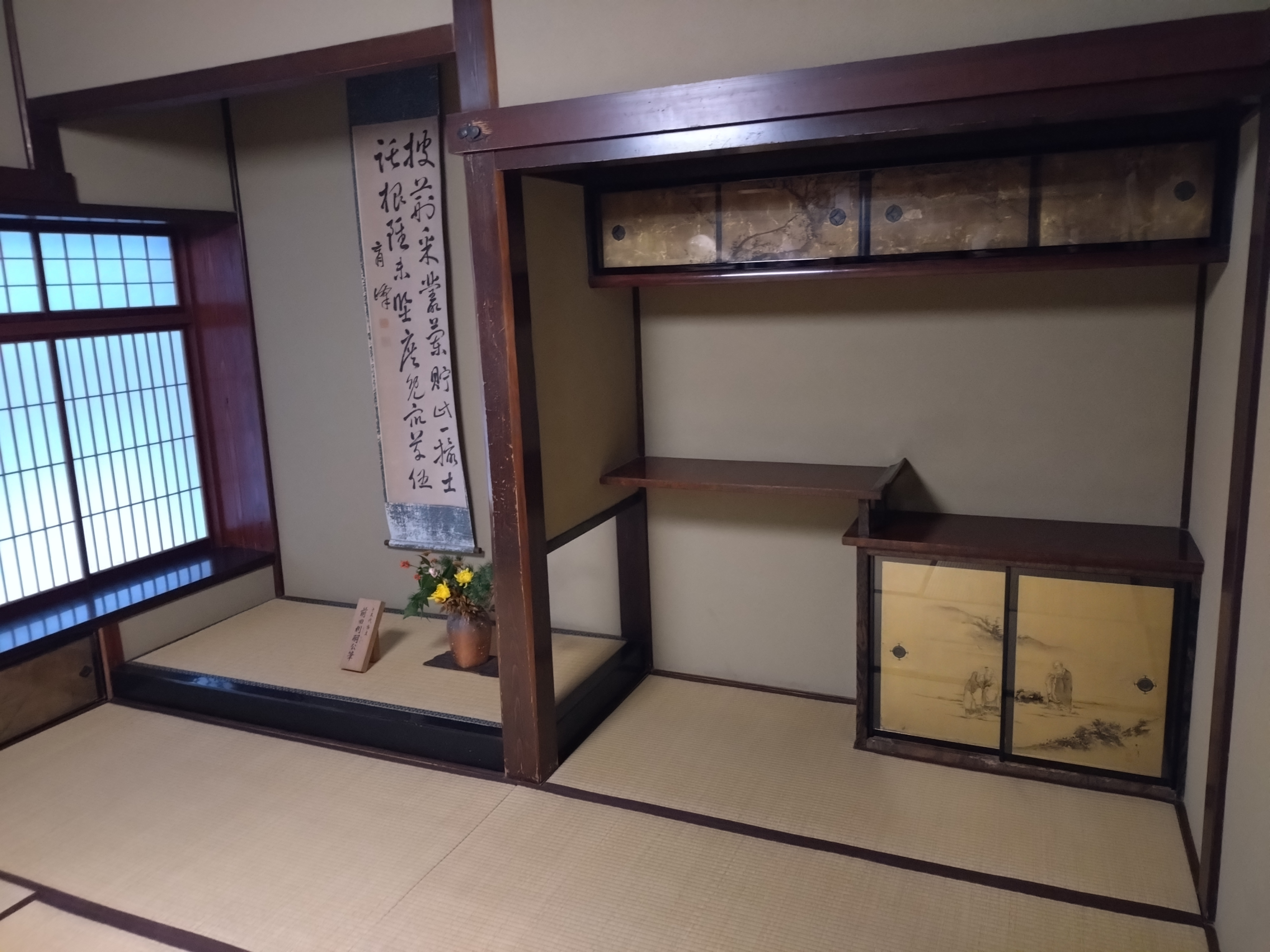 奥の間に設けられた床の間は、 金箔と掛け軸が一体となって、上級武士の格式と美意識を伝える空間です。