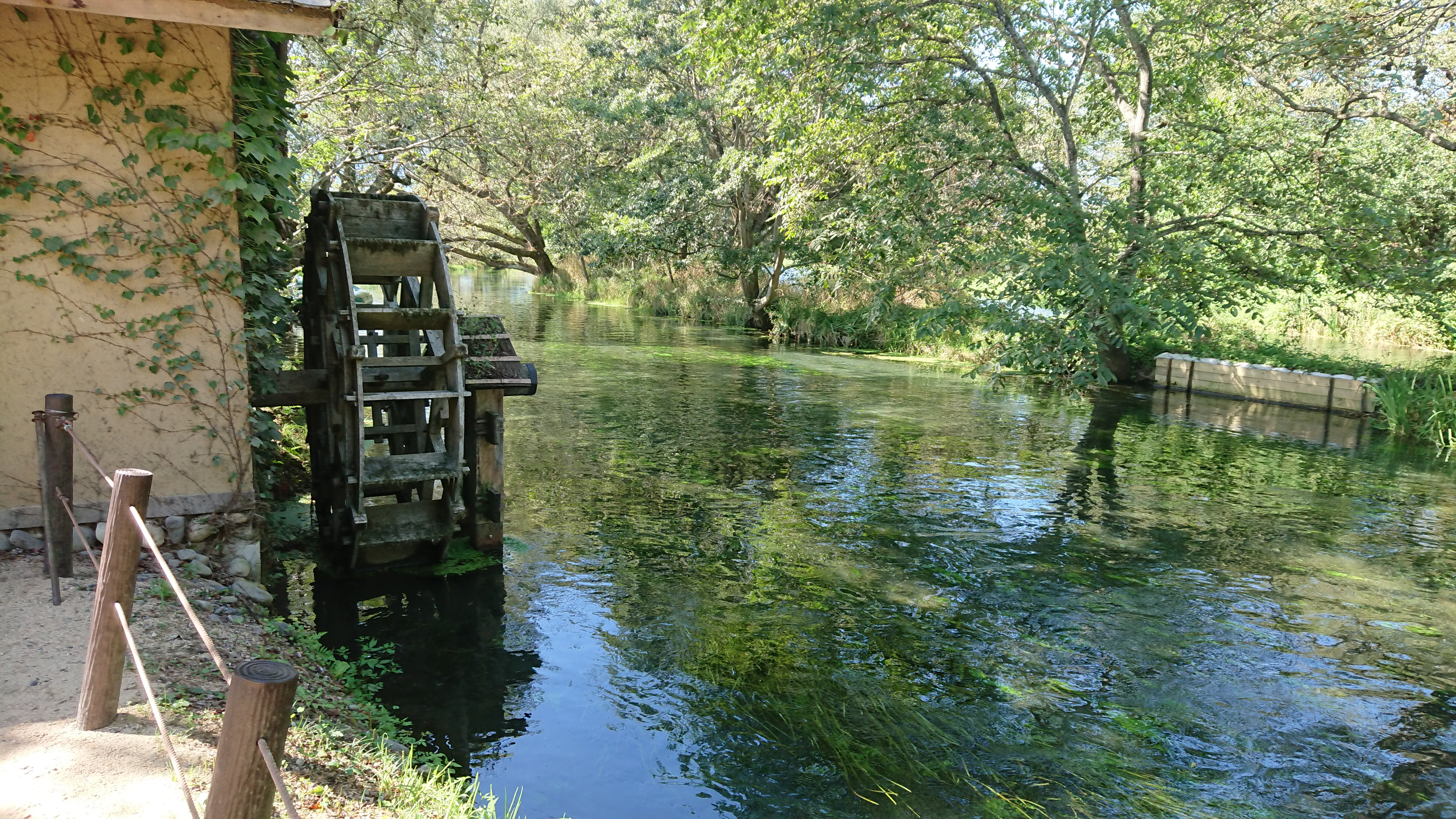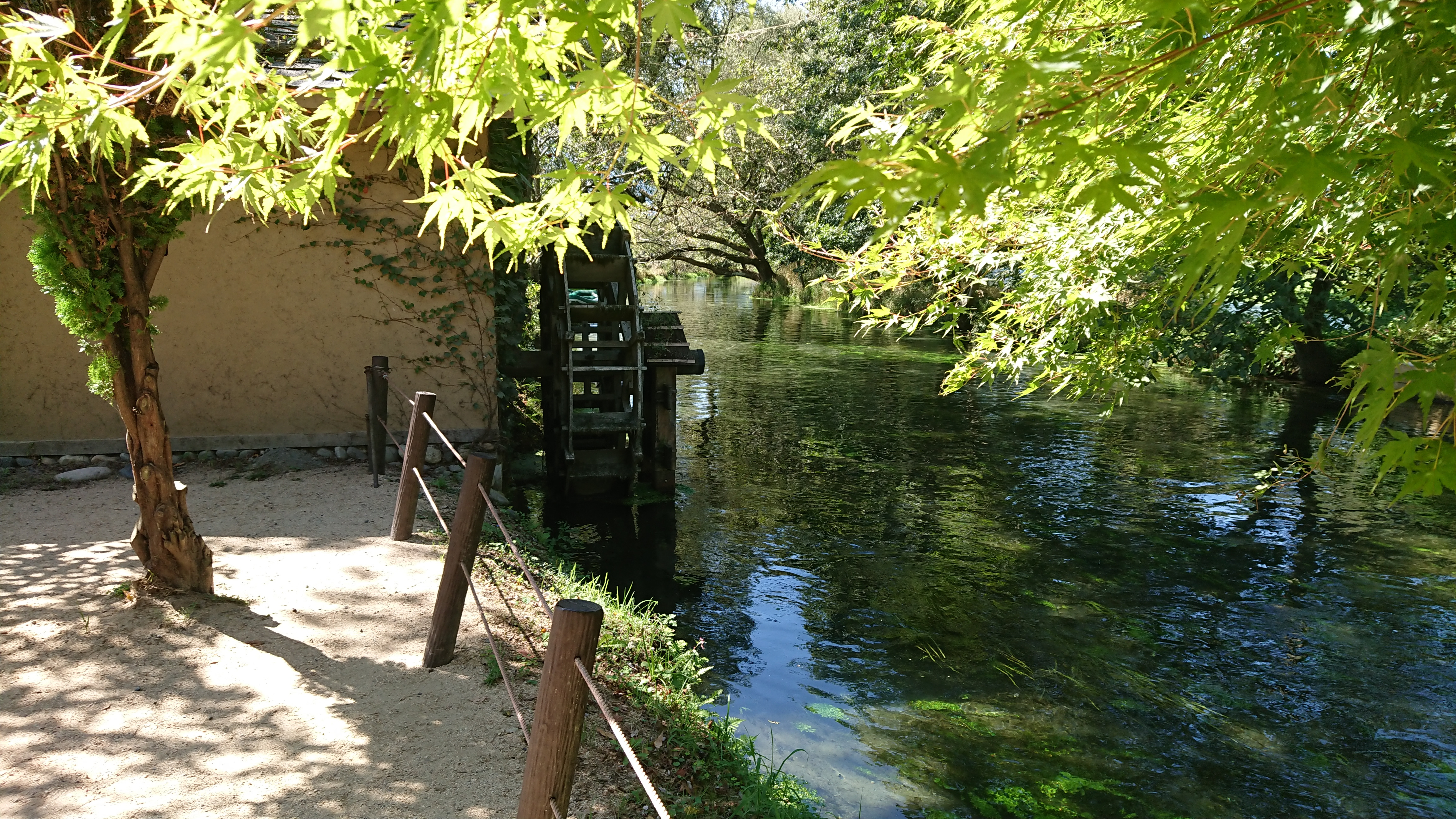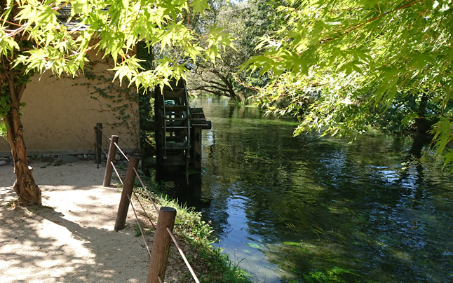 国土交通省からは「水の郷」にも認定。その美しい水辺の風景が見られるが、大王わさび農場にある蓼川(たでがわ)の水車小屋。
