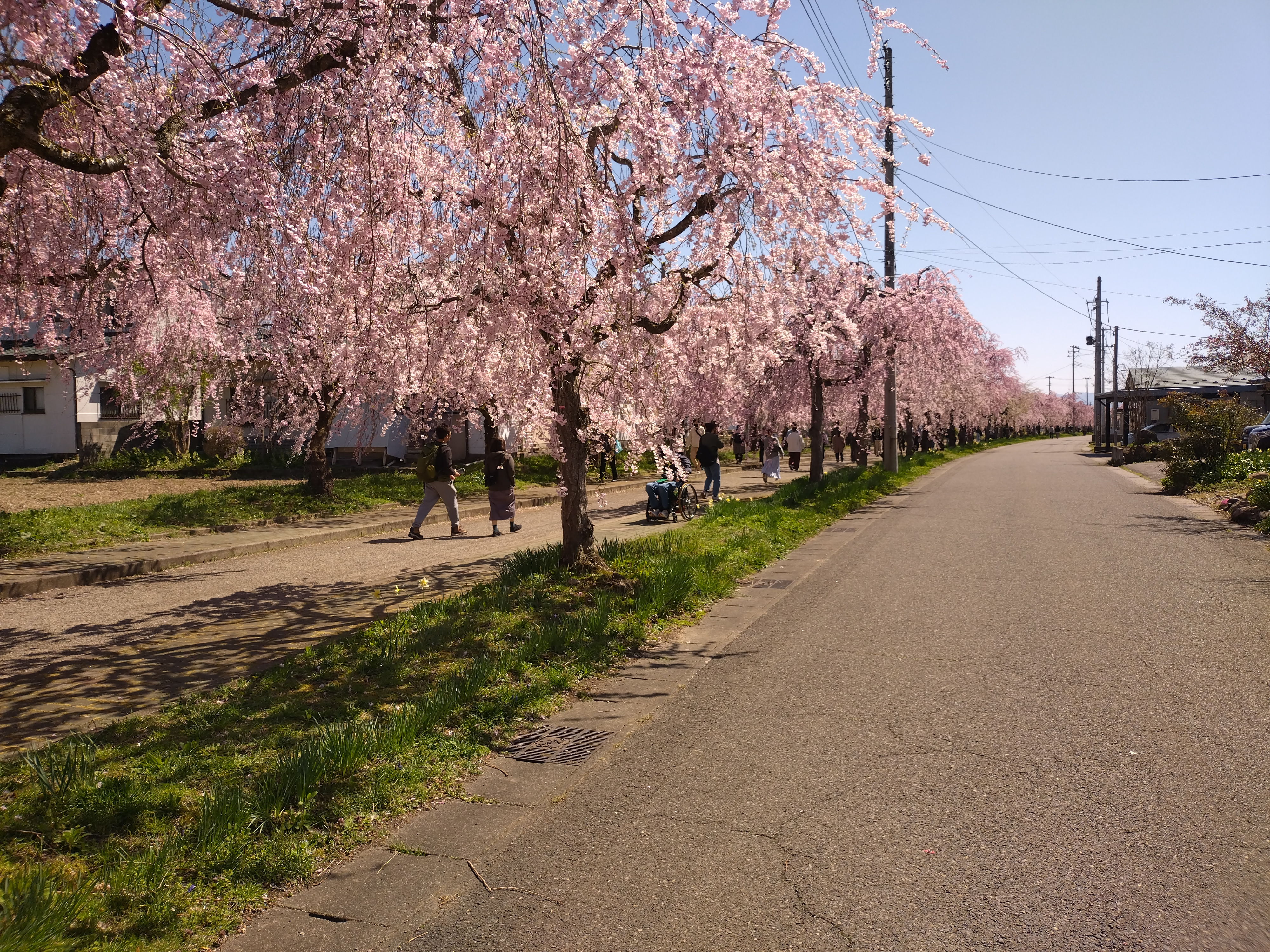 遊歩道のわき道から見るとしだれ桜が長く続いているのがわかります。
