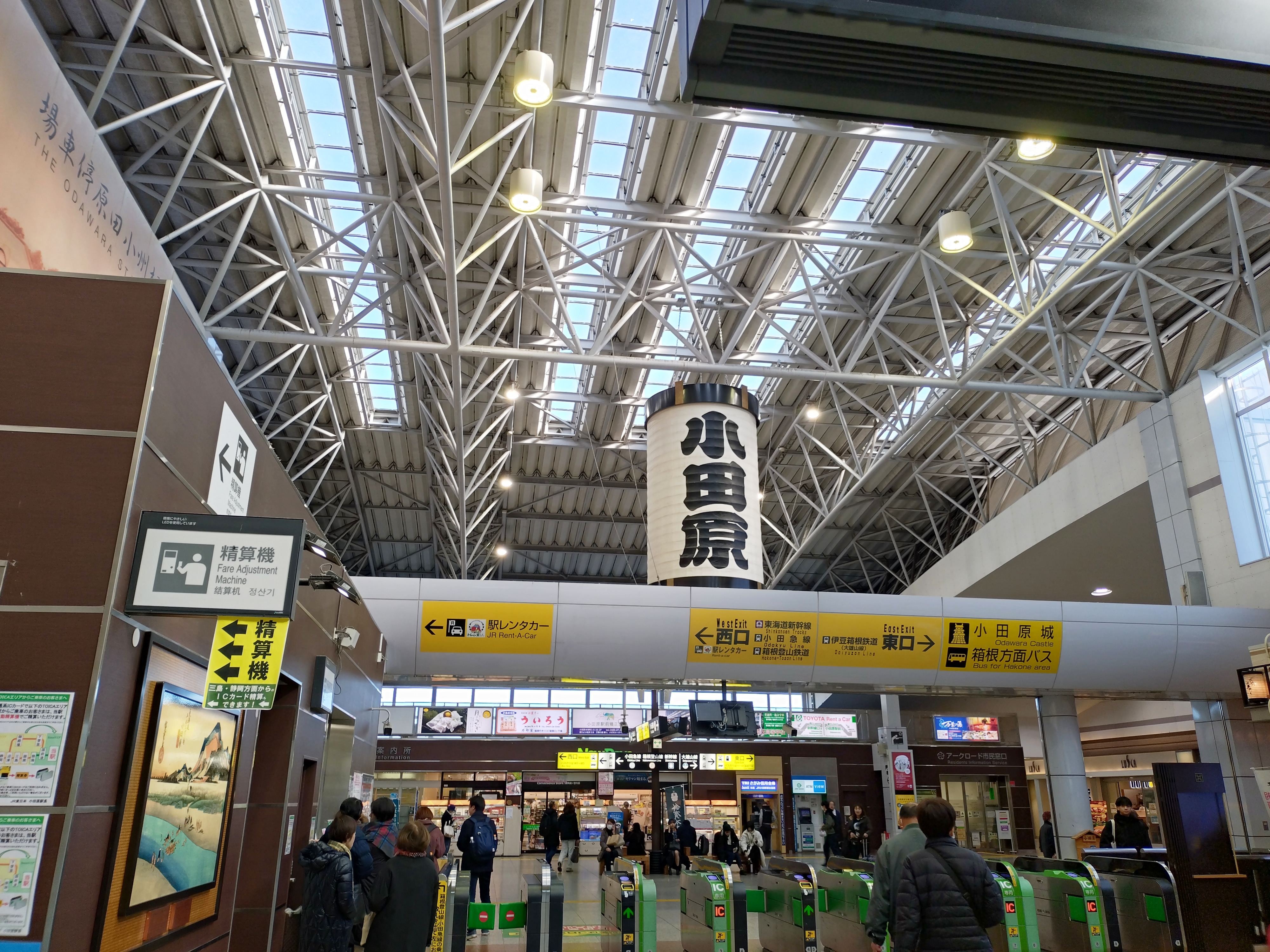 改札口の頭上にある巨大なの小田原ちょうちん。目立ちます。