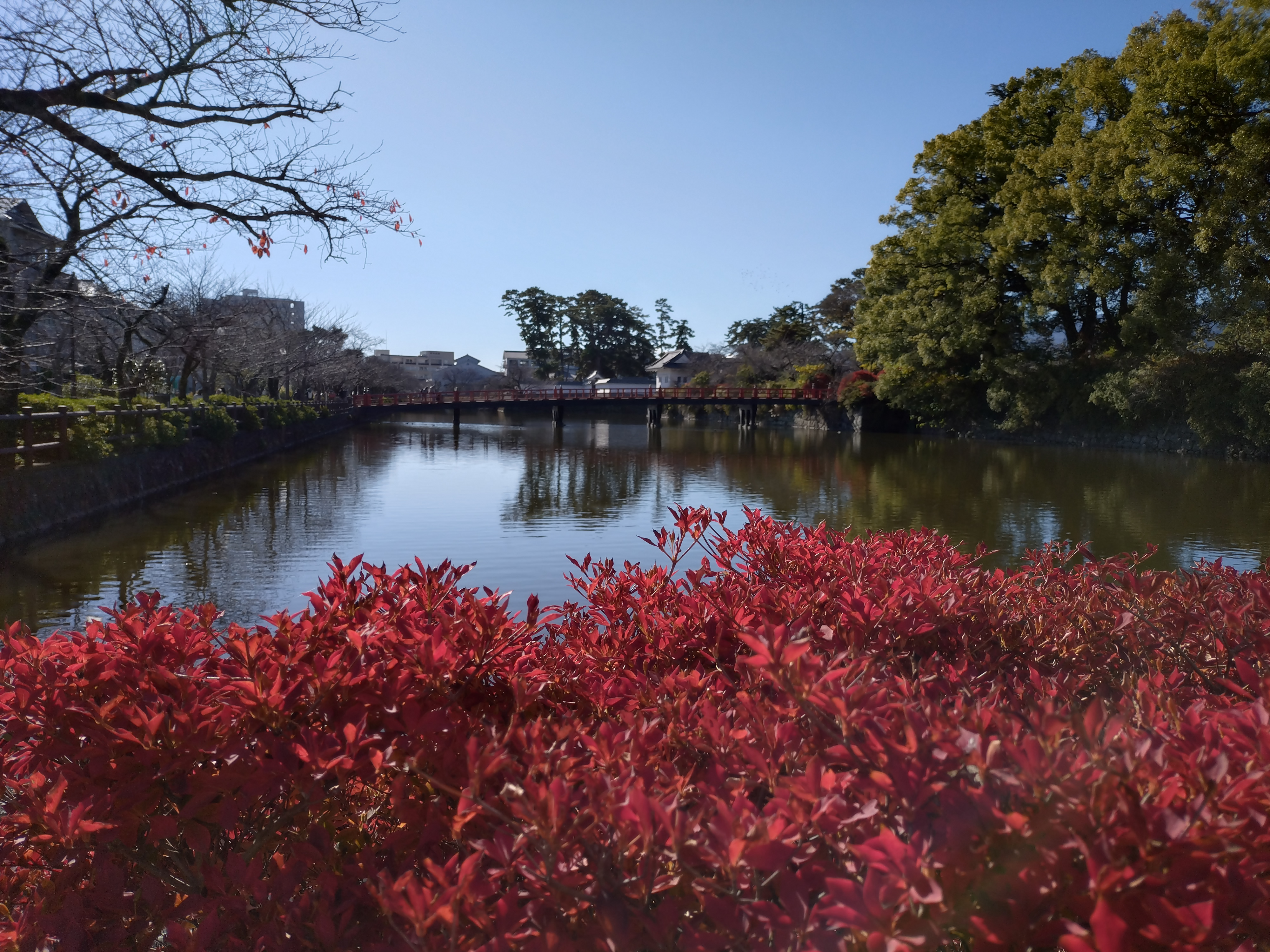 小田原城址公園のお堀にかかる赤い「学び橋」は、市民のシンボル的存在。