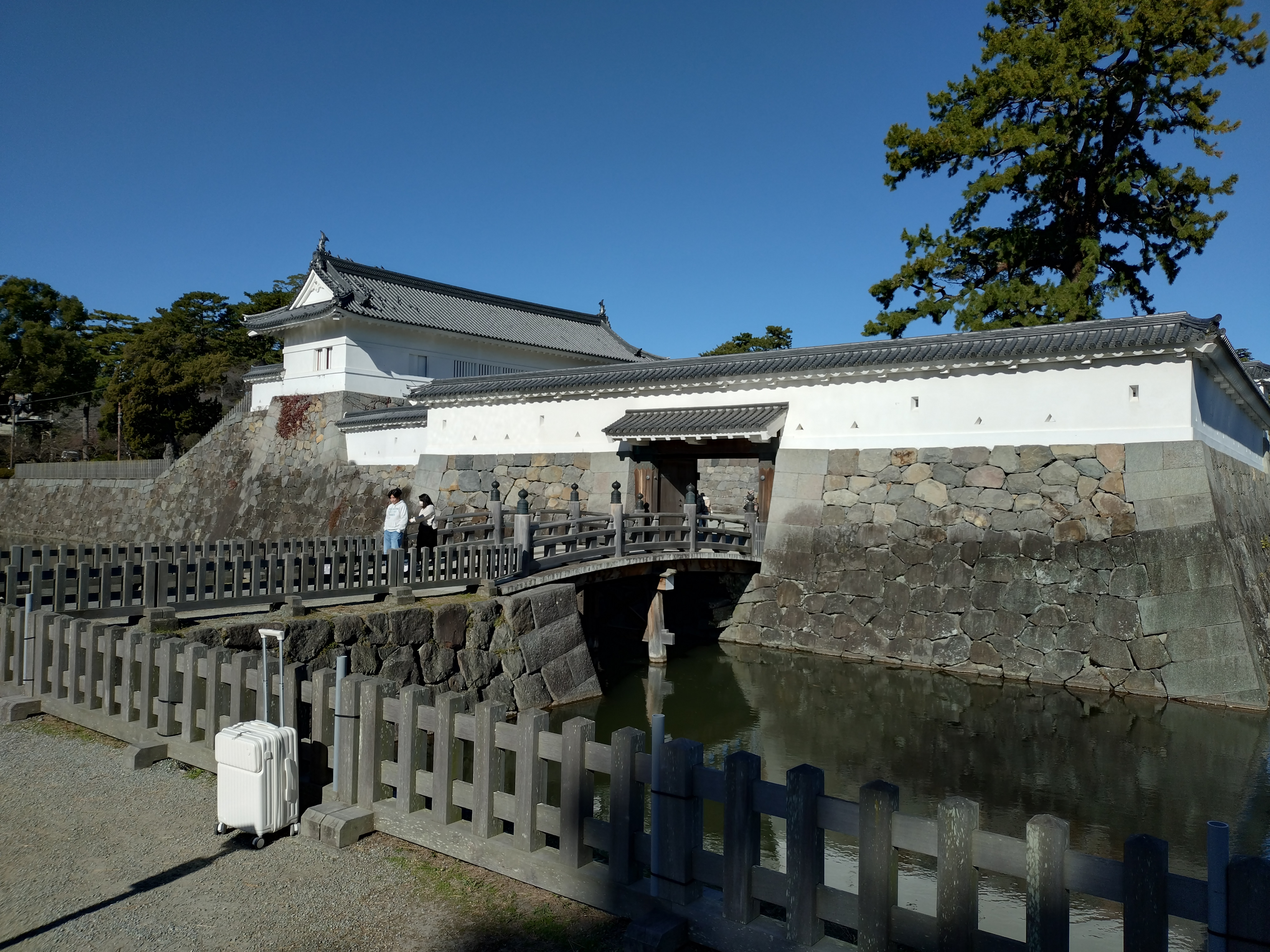 住吉橋は、長さ8・6メートル、幅3・6メートル。欄干にヒノキ、床板に米ヒバ、橋脚にマツが使われている。銅門に入るための内仕切門と一体となっており、アーチ状に反るなど伝統的な木橋の特徴を持つ この橋を維持するのにお金が掛かっている。