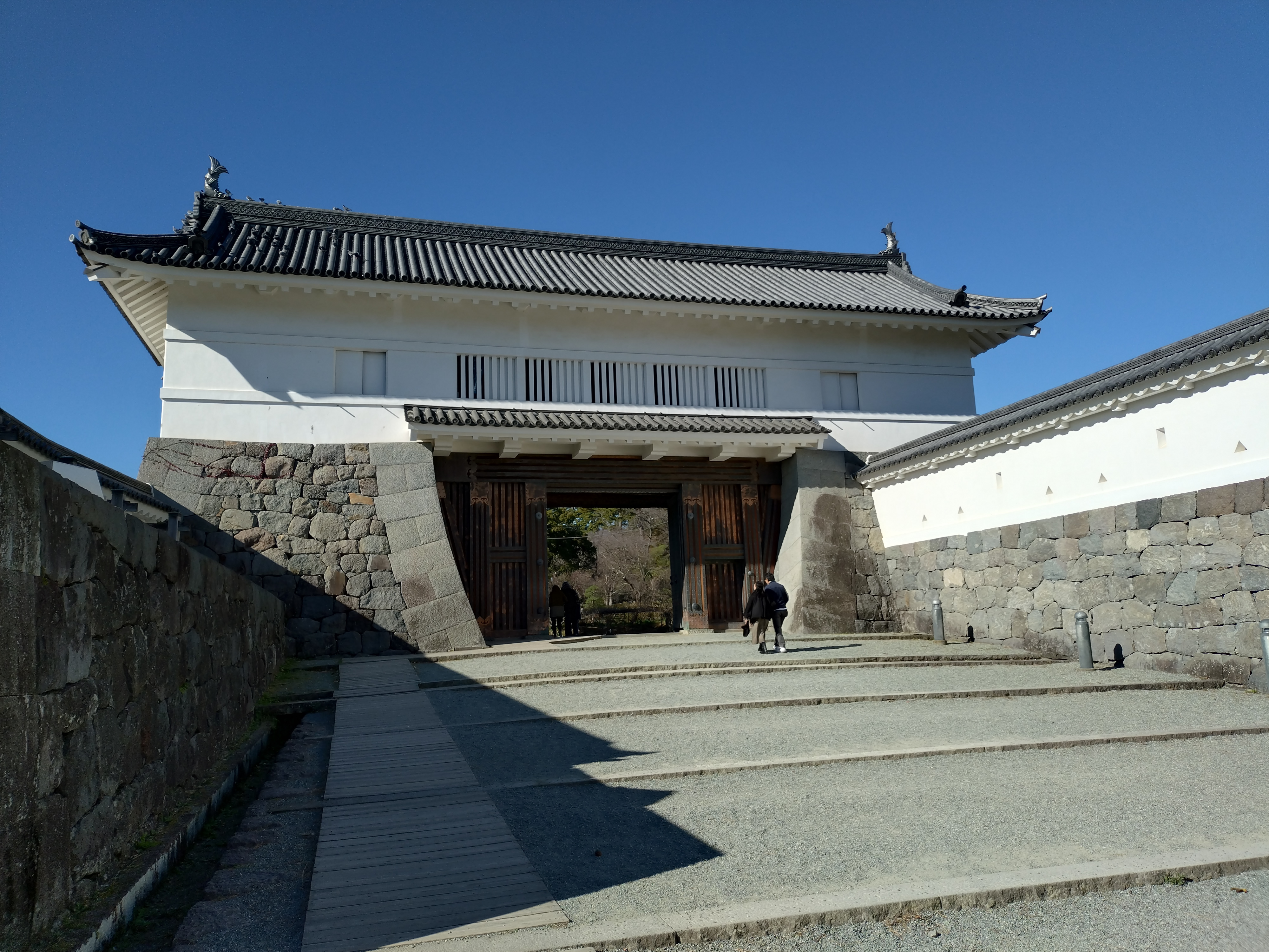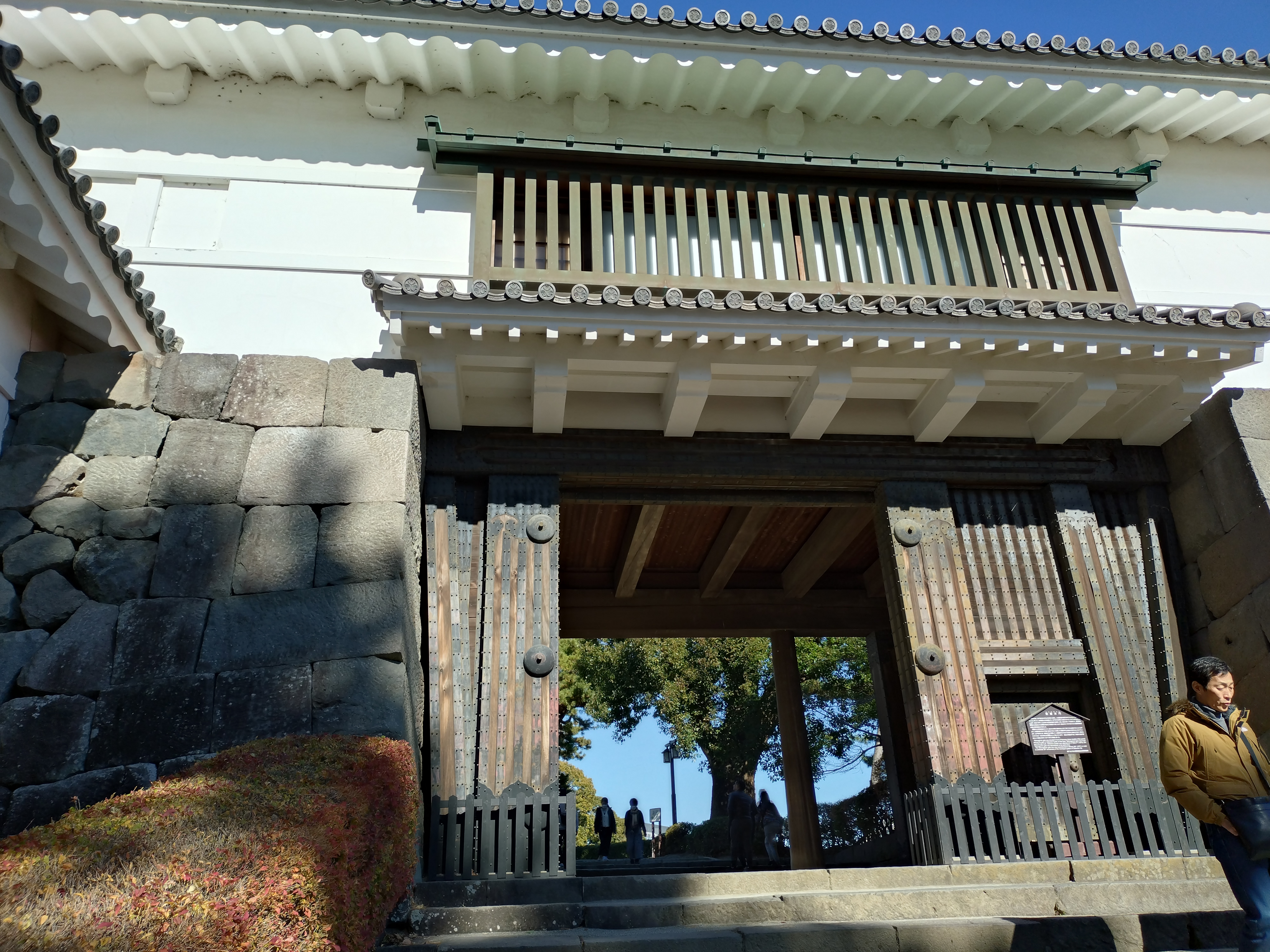 江戸時代の二の丸表門で、石垣による枡形、内仕切門、櫓門を組み合わせた枡形門と呼ばれる形式。明治に入って解体されてしまうが、1997年(平成9年)に復原された。銅板の装飾が施されていることからこの名がつけられている。 石が立派です。 石垣の積み方が綺麗です。