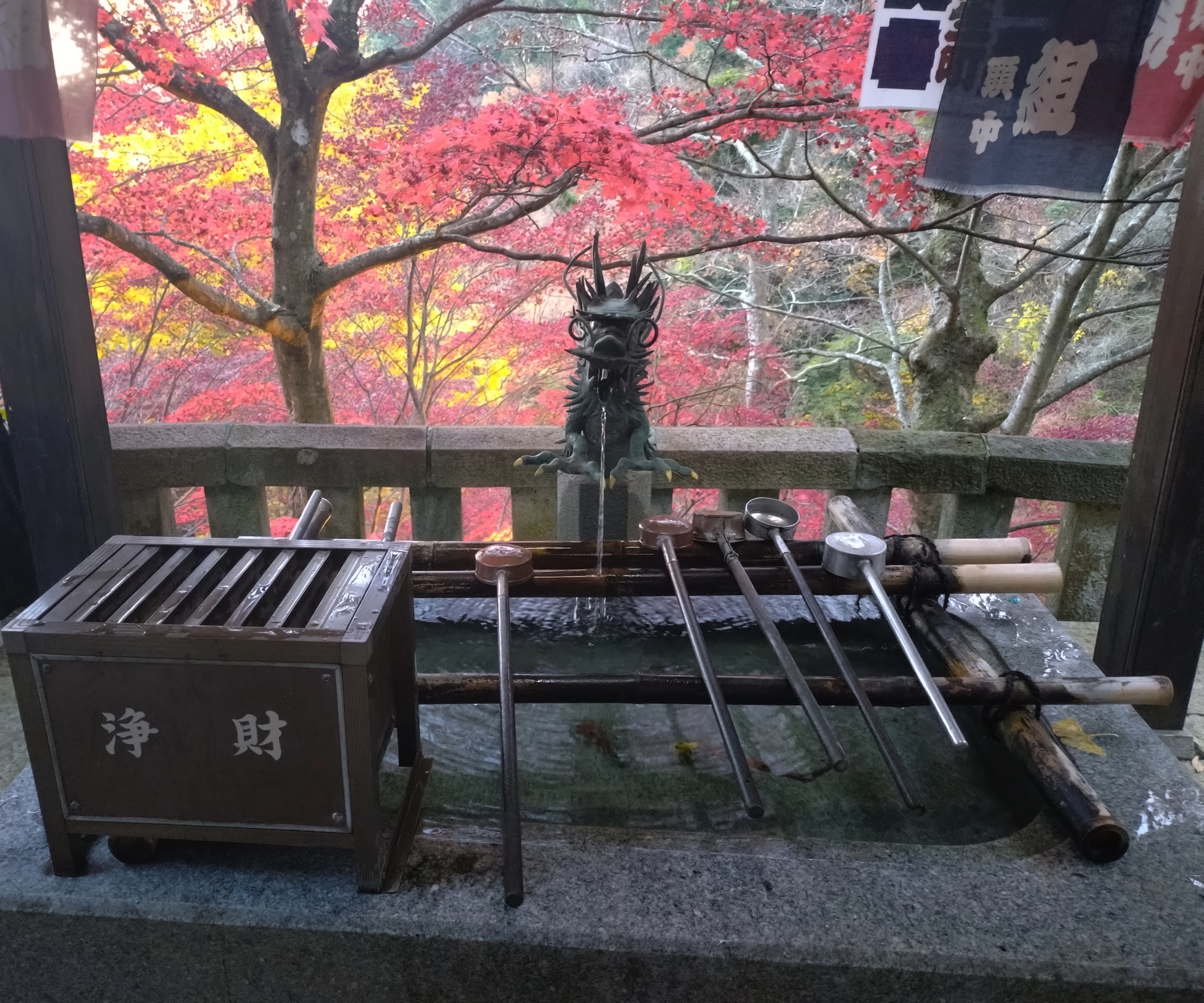 龍の手水舎(てみずや)の後ろに見える紅葉が綺麗でした。