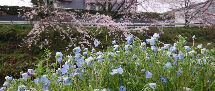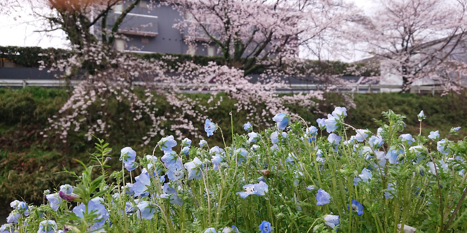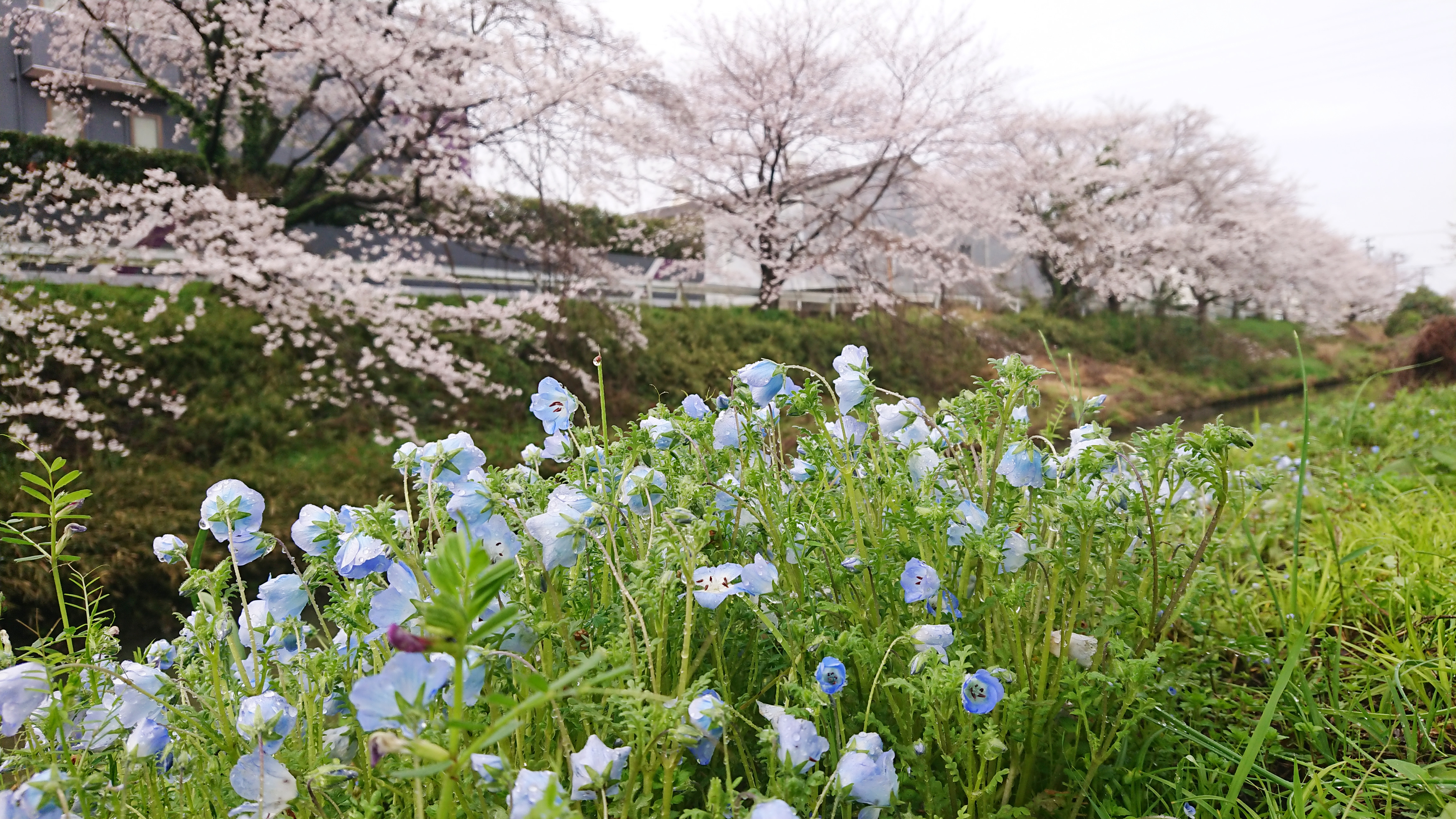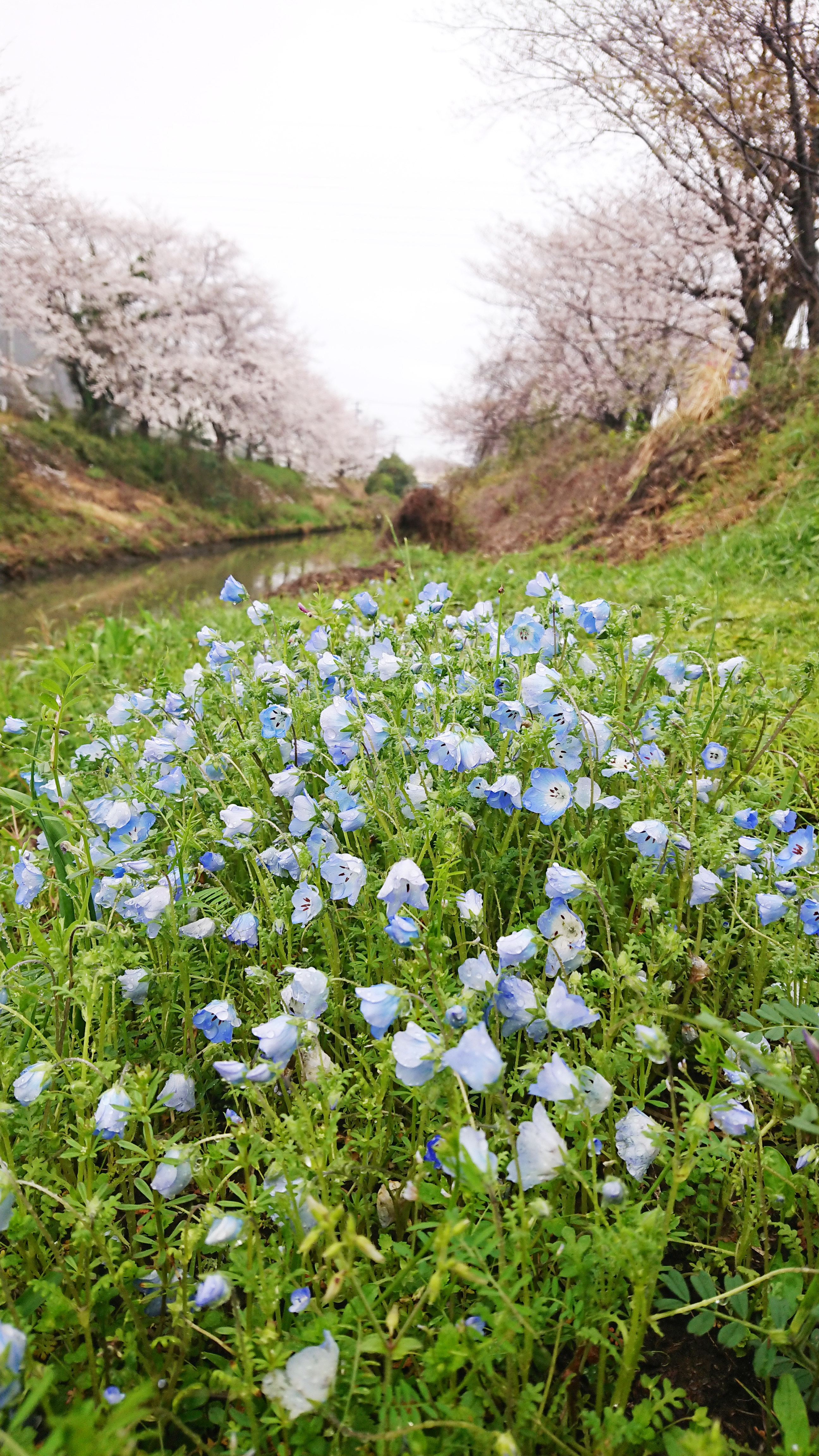 ネモフィラは、晴れでないと華が開かないので目立たないですが開花時期です。 雨だったのが残念です。