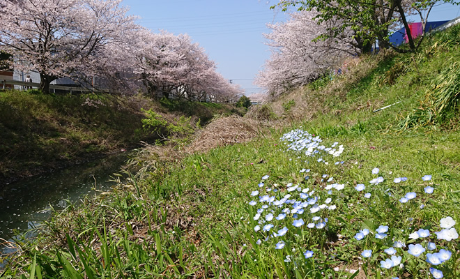 矢那川のネモフィラと桜。同時期に咲く姿はとても綺麗です。 …