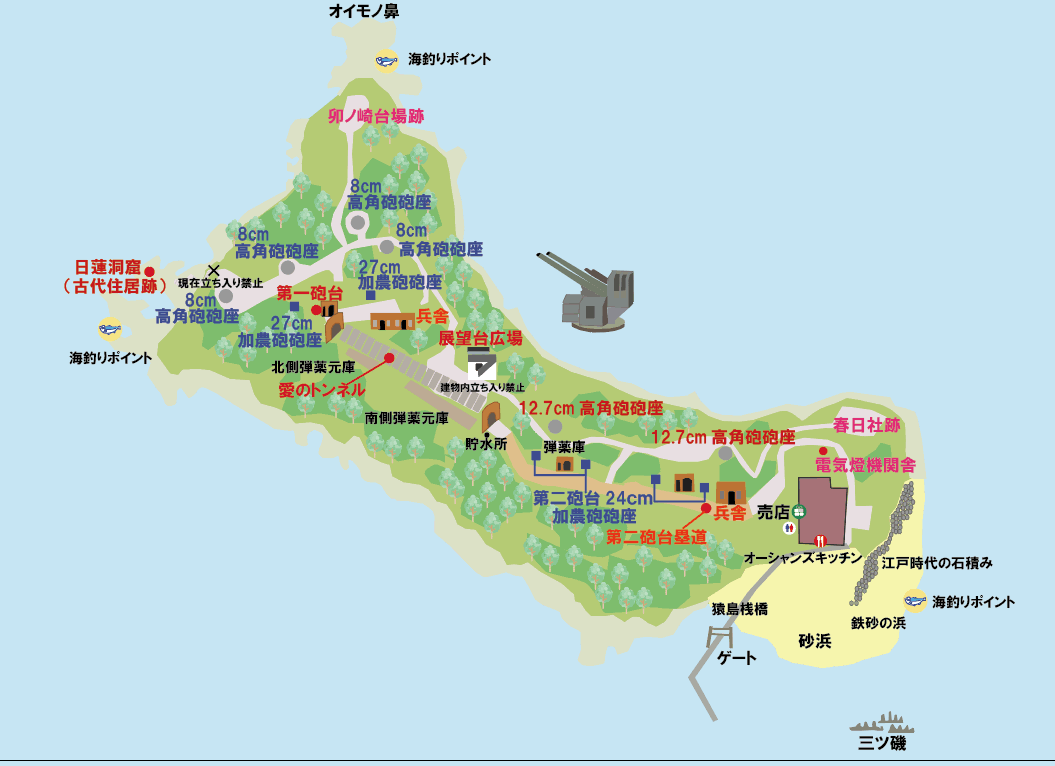 島内には明治時代の煉瓦造の掩蔽部(ルビ:えんぺいぶ)や弾薬庫、隧道などが良好に残っており、東京湾要塞跡として国の史跡に指定、日本遺産の構成文化財にも認定されています。