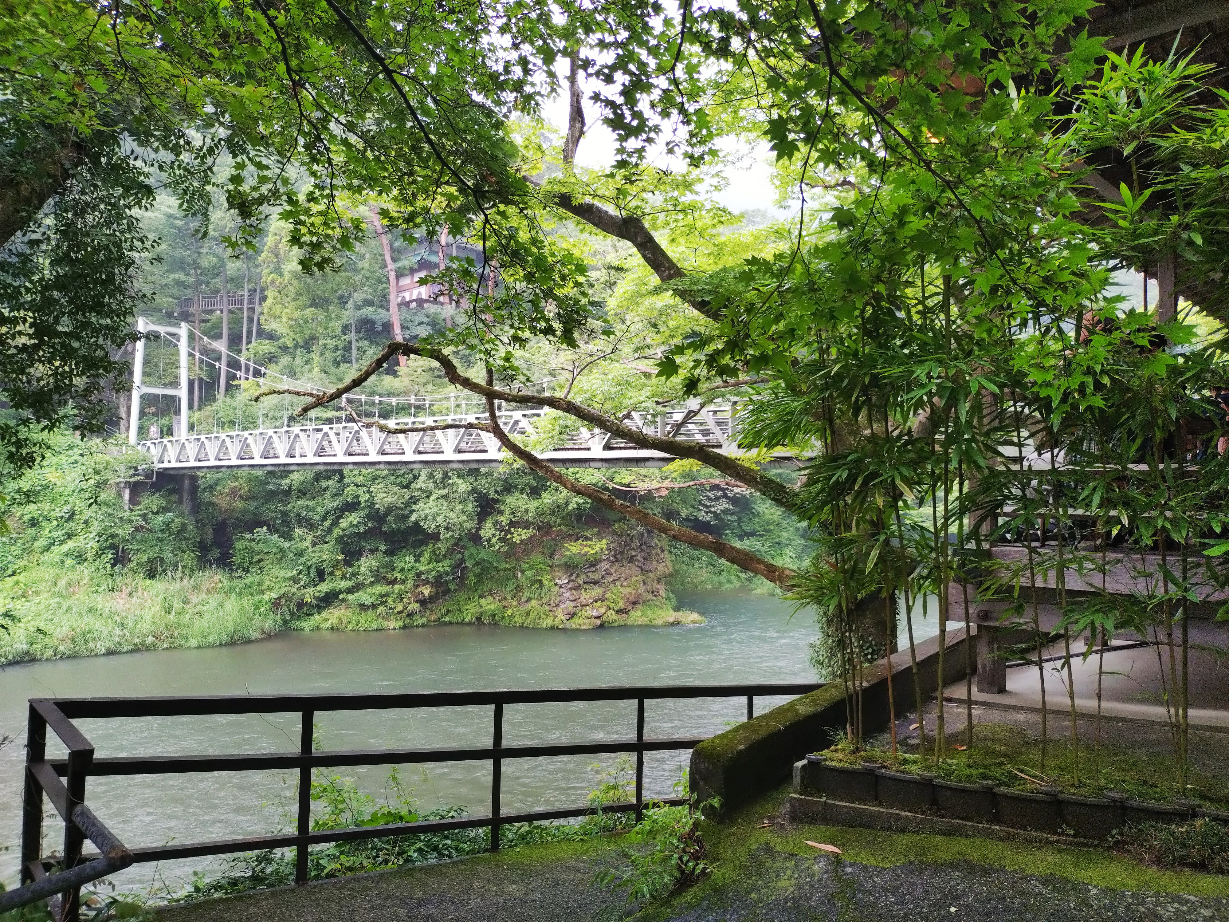 橋からの眺めは、川の勢いのある流れや沢井園の風情ある建物が見られ景色がいいことがわかります。