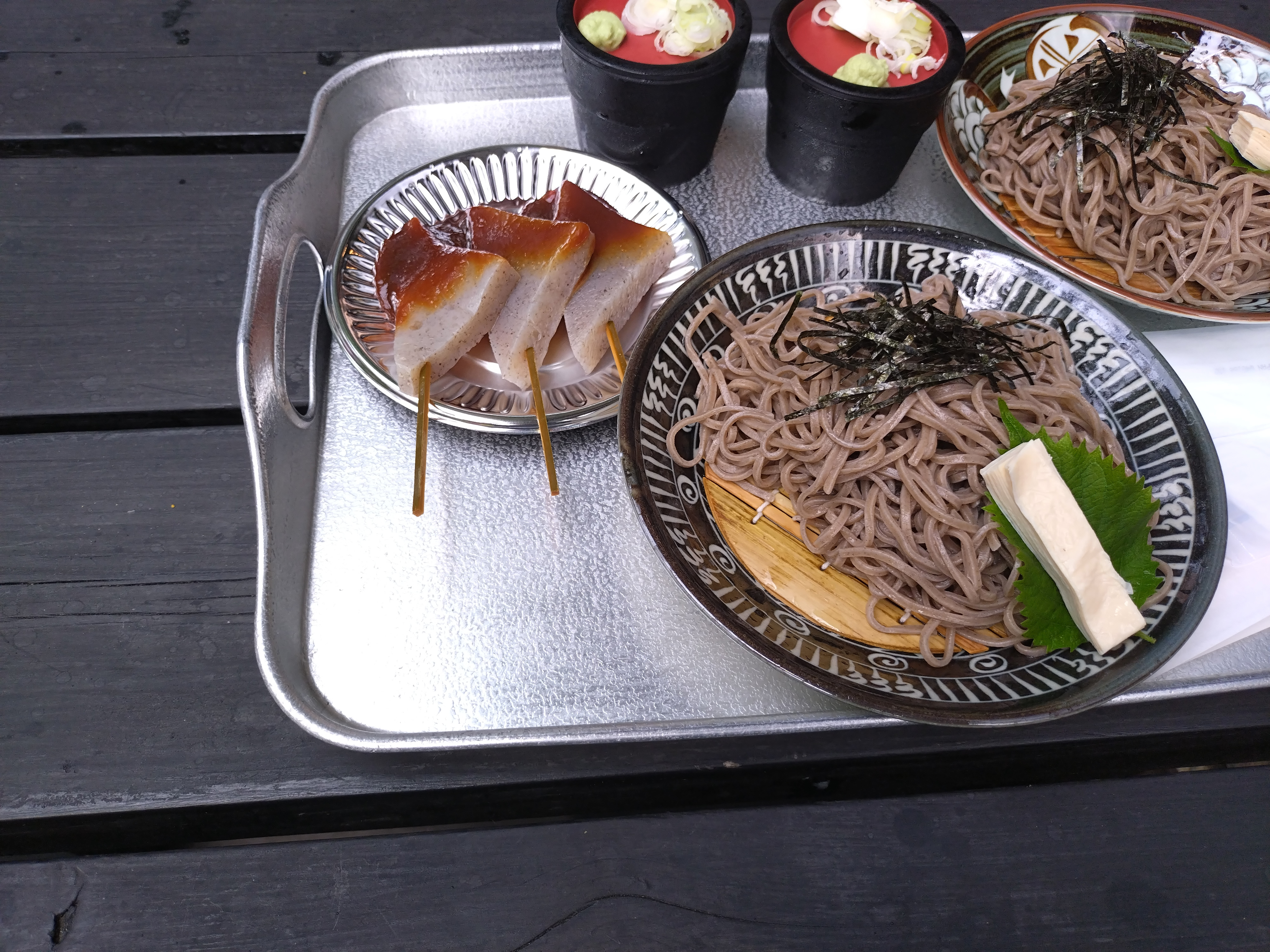 お腹がすいたのですが席を確保しないと食べれないので席取りが大変です。 軽食で済ませる事にざるそばと味噌こんにゃくを頼みました。手打ちではないですが暑かったのでおいしくいただけました。