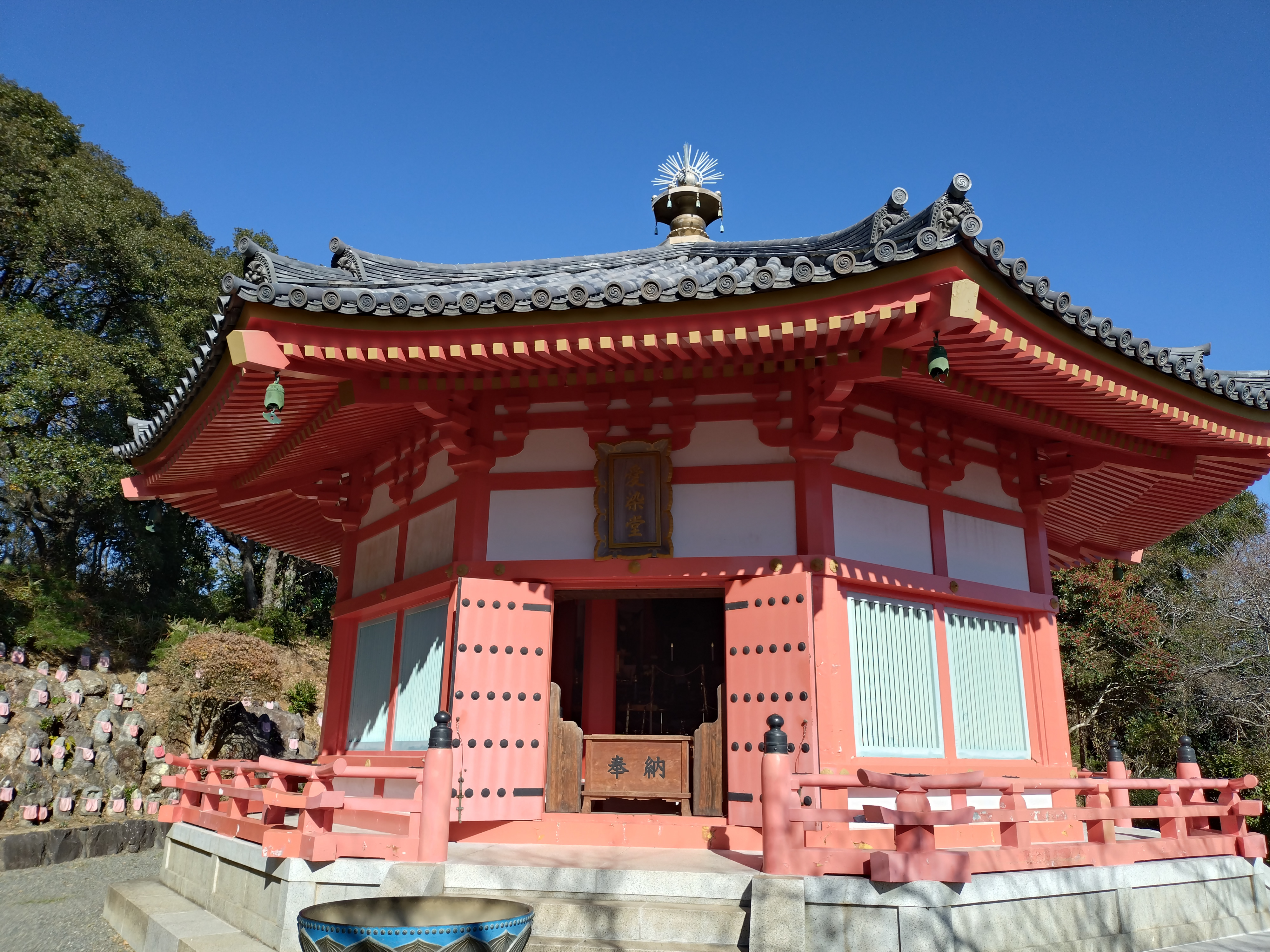 奈良法隆寺の夢殿を3分の2の大きさに再現。(昭和49年6月11日 設立) 御本尊「愛染明王」は、元鎌倉八幡宮愛染明王堂の御本尊で仏師運慶の作と言われており敬愛、子宝に、縁結びなど特に女性には肝要の守本尊として、各地の方々に広く信仰されています。