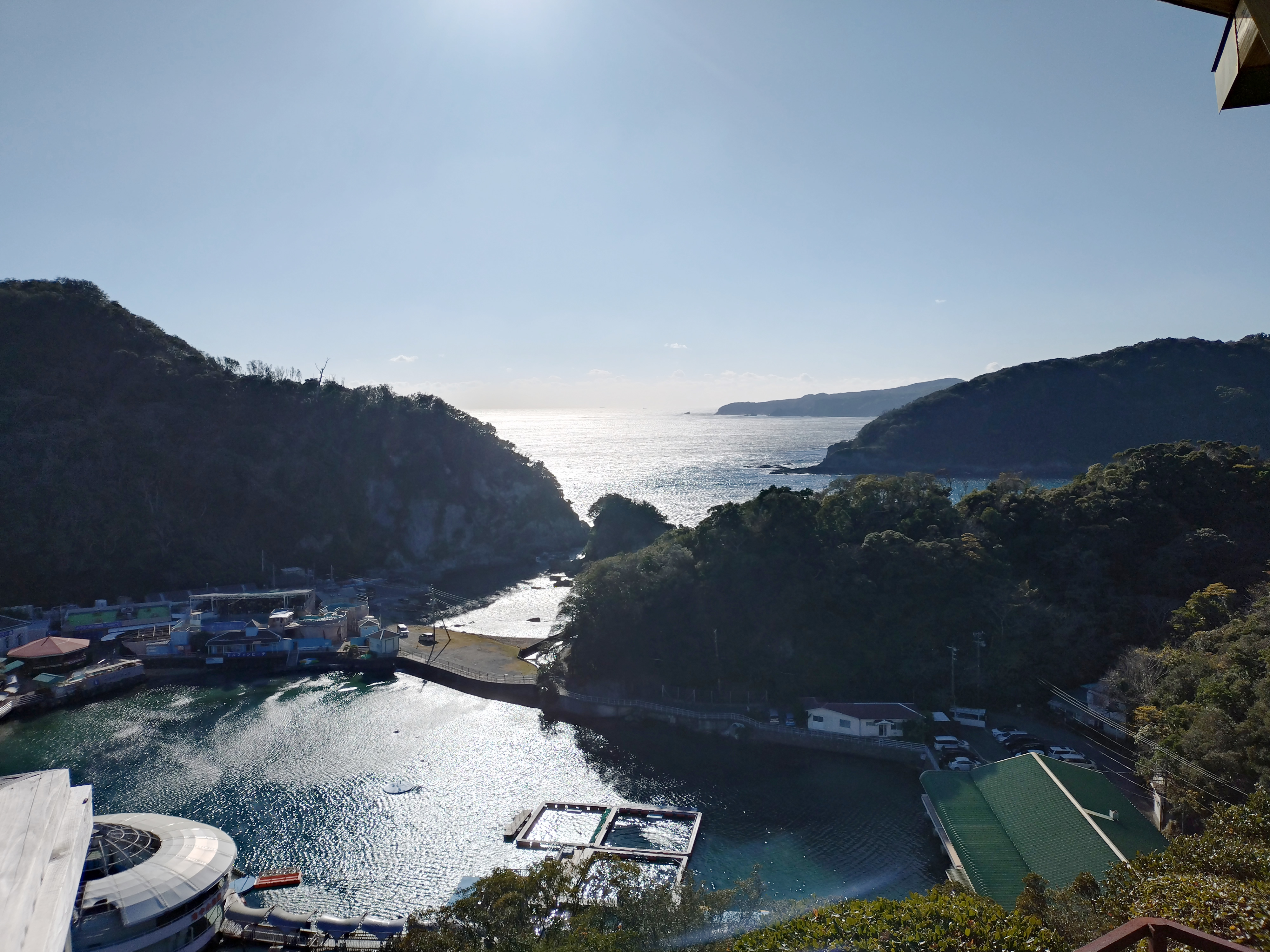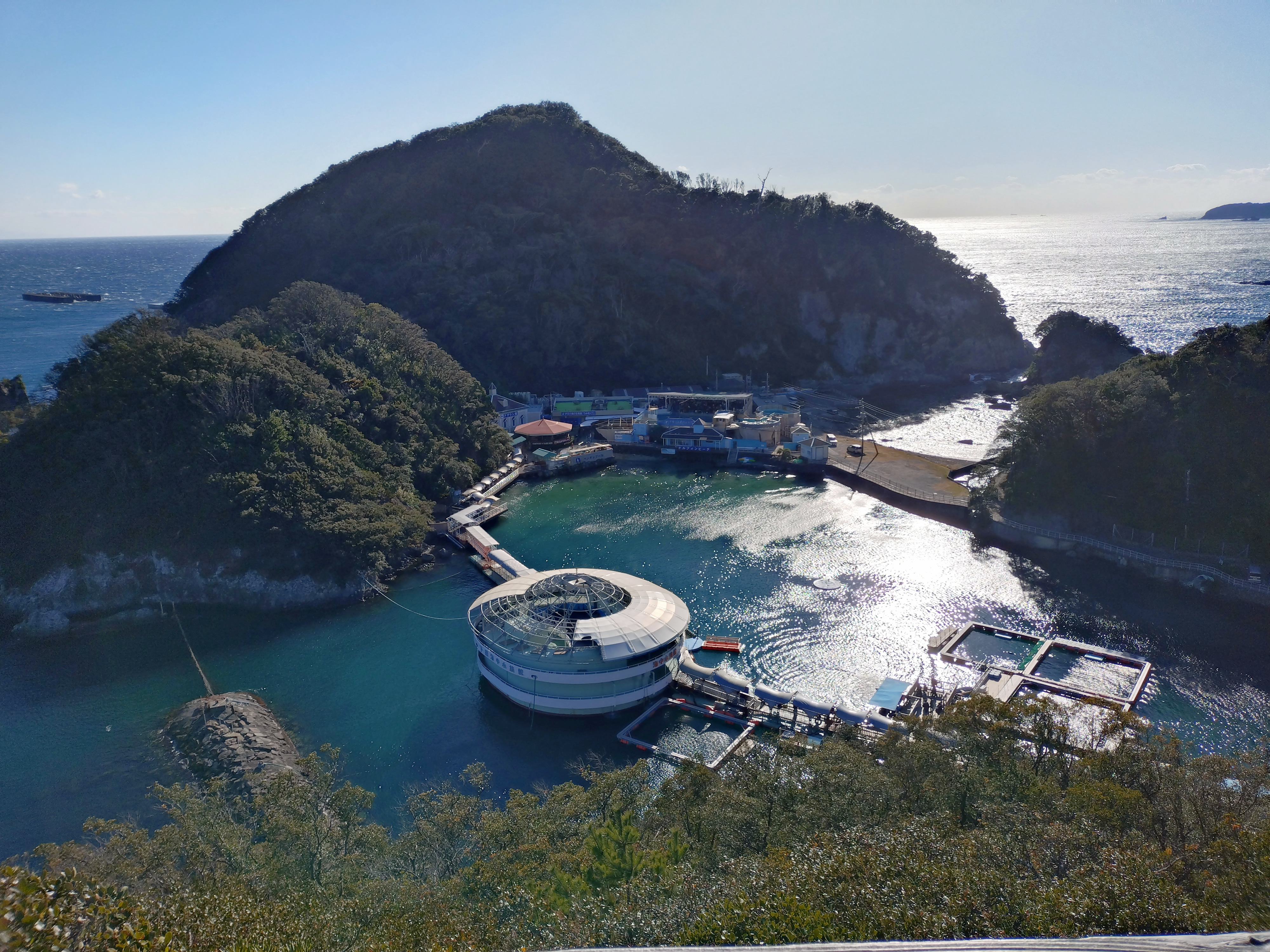 太陽が海に反射きらきらと輝いています。下に下田海中水族館が見られます