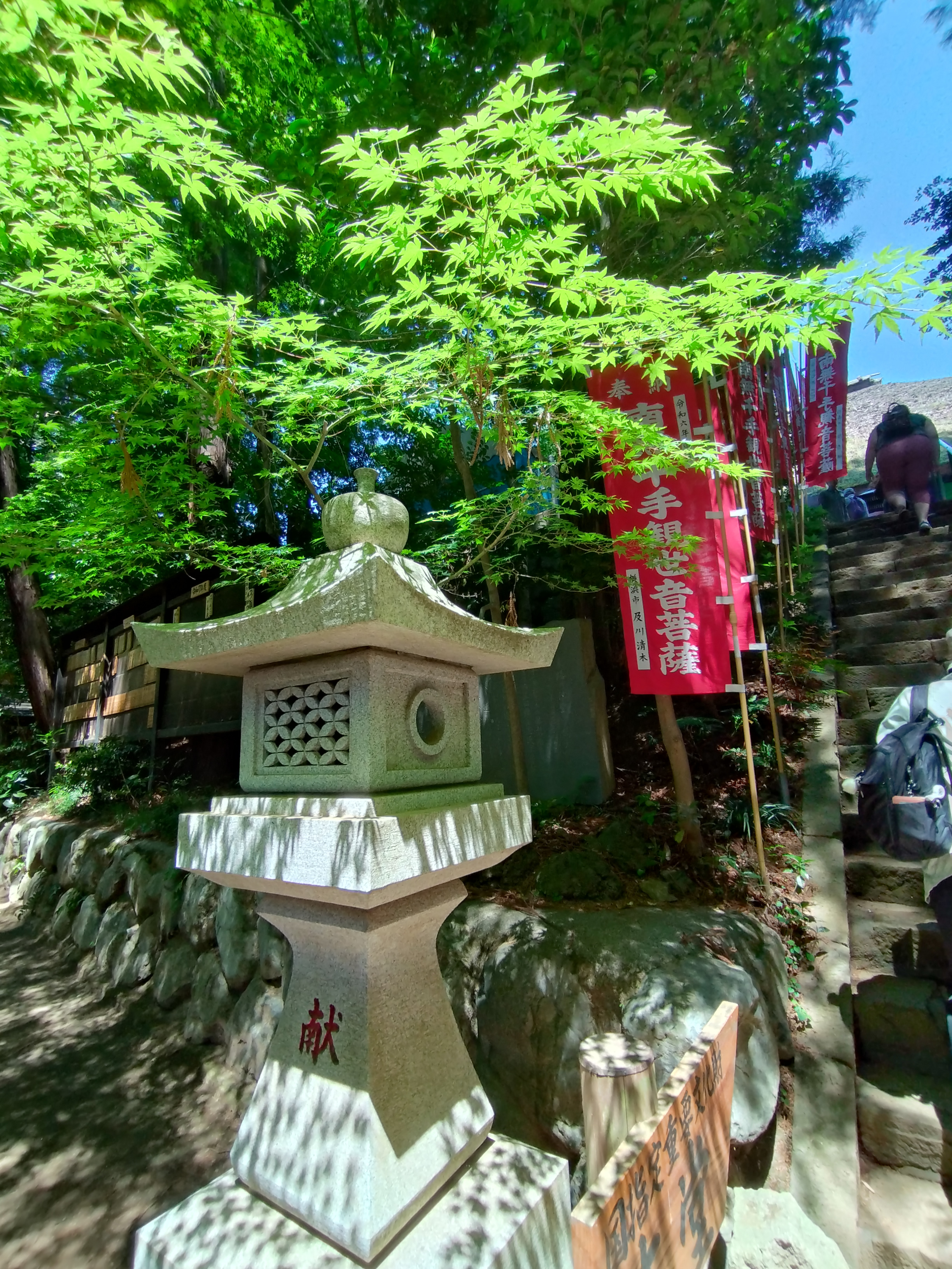 青もみじの下に佇む灯篭は、の美しい情景を演出します。新緑のもみじが陽光を透かし、灯篭の石肌に柔らかな影を落とす様子は、静寂と清涼感に満ちています。