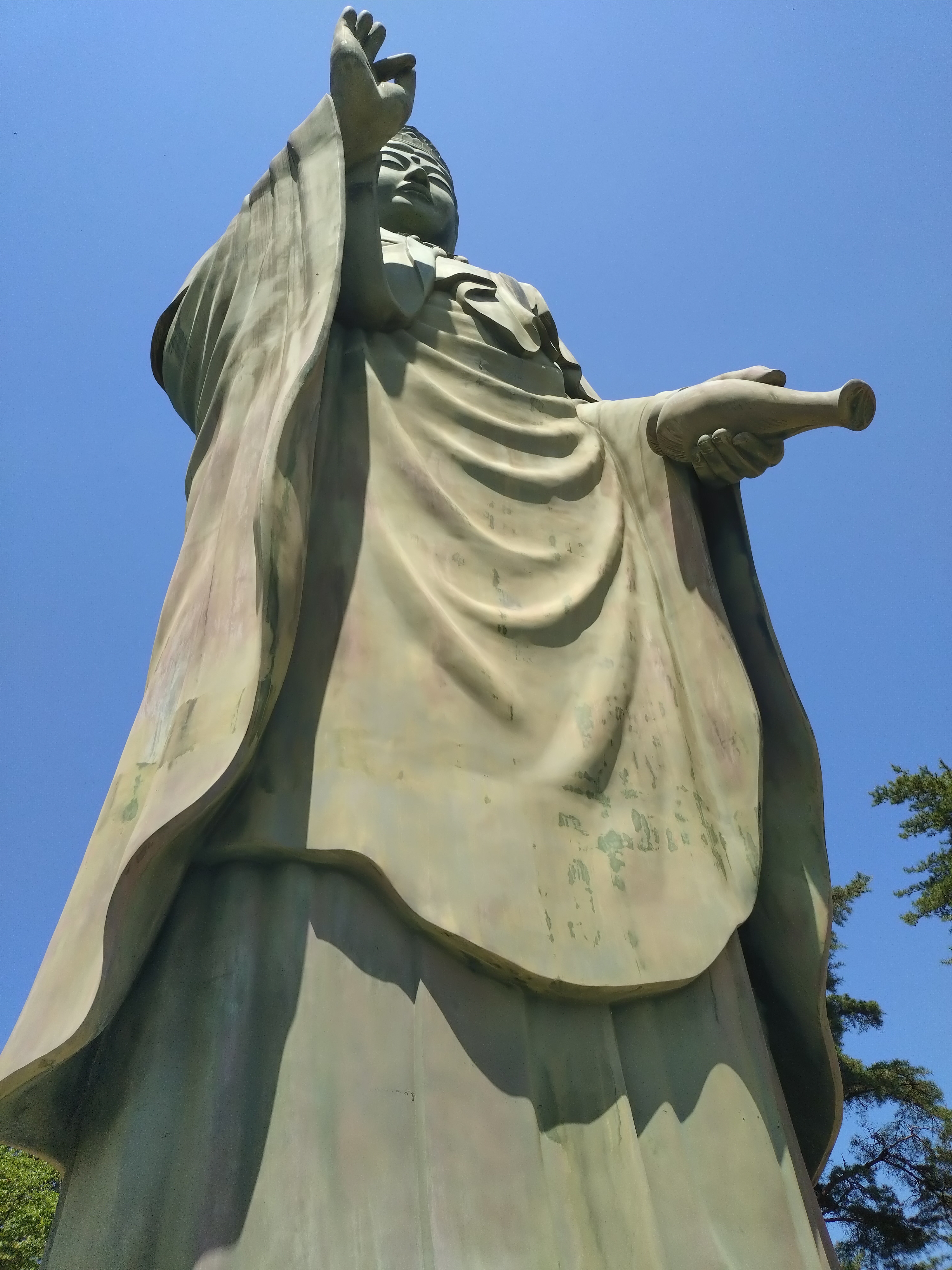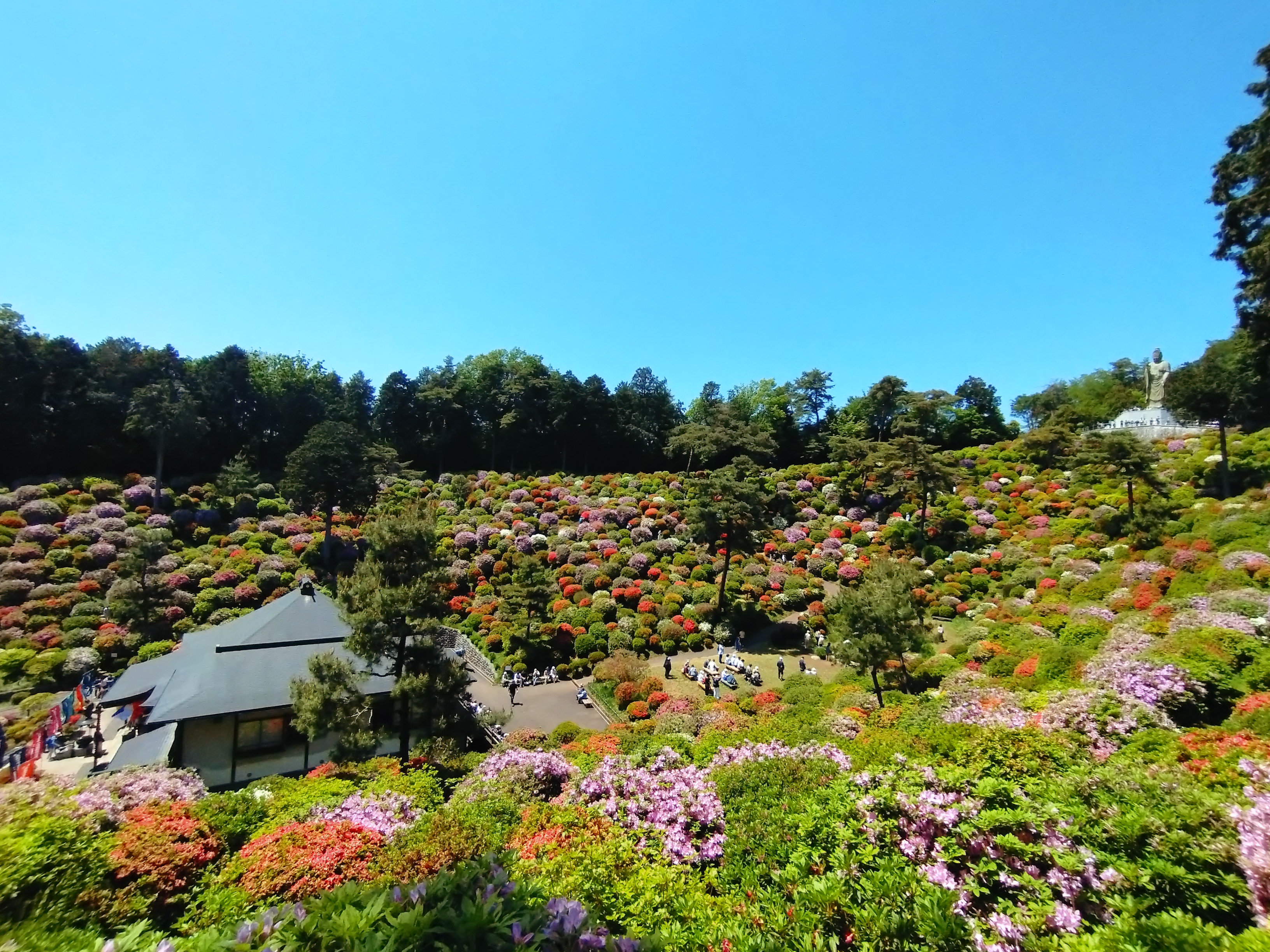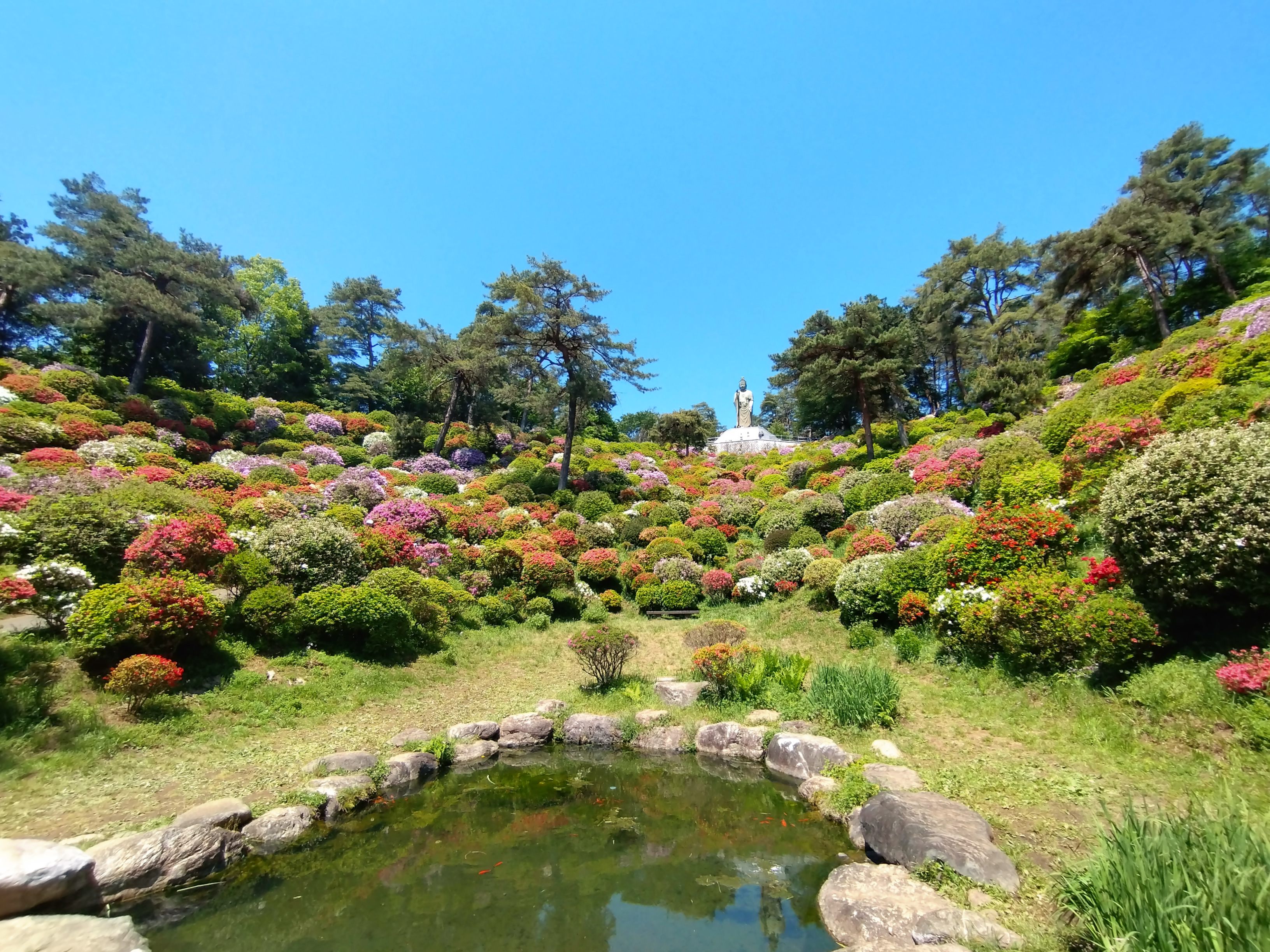 平成22年(2010年)に建立され、台座を含めた高さは約15メートルに達します 観音像は境内の最上部に位置し、周囲を彩るつつじ園を見下ろすように立っています。 とても迫力があります。