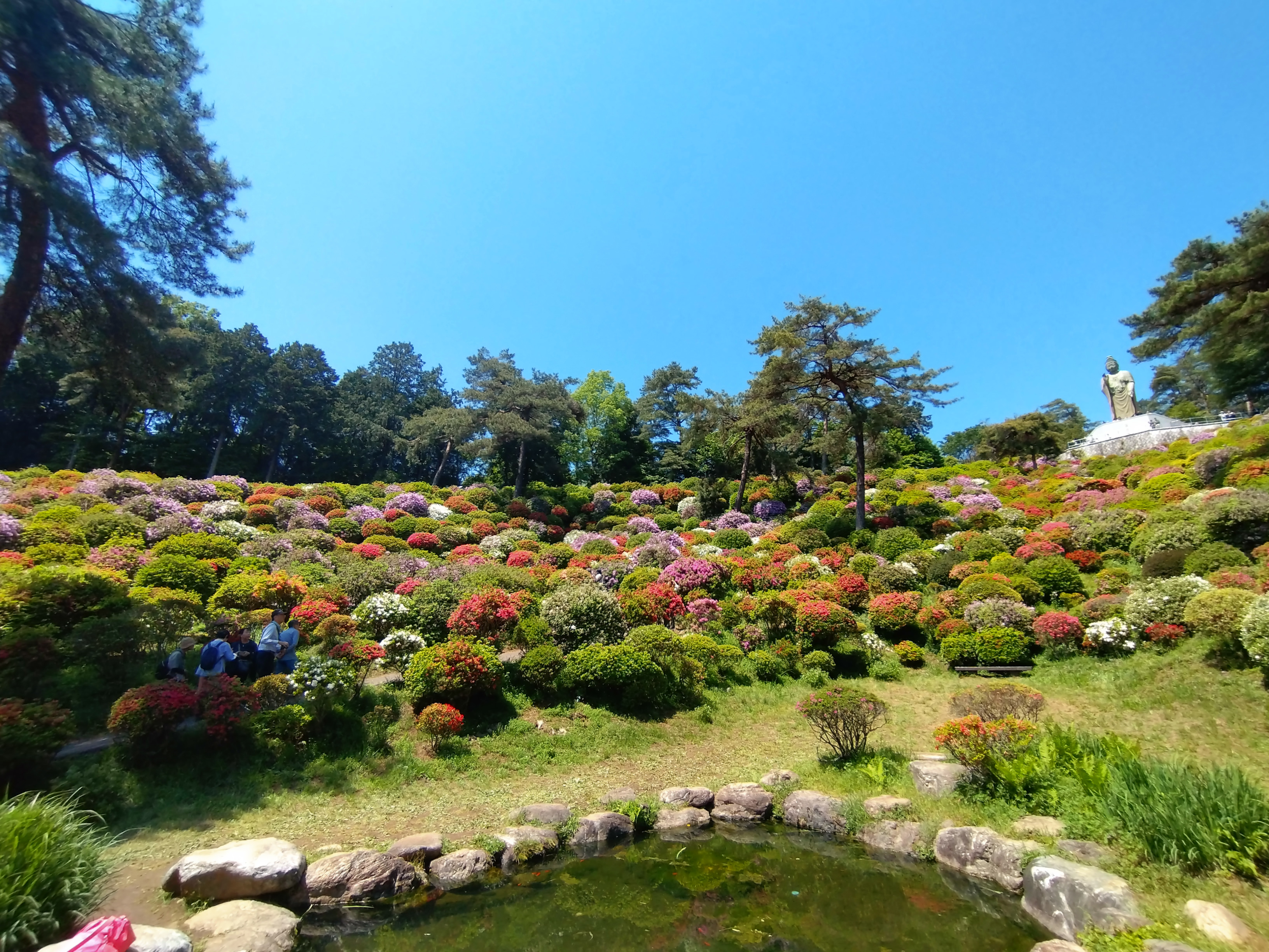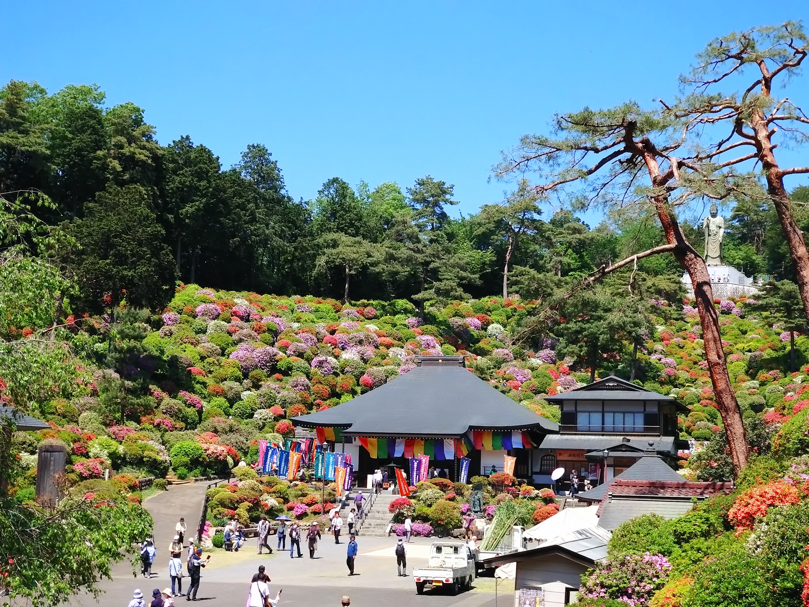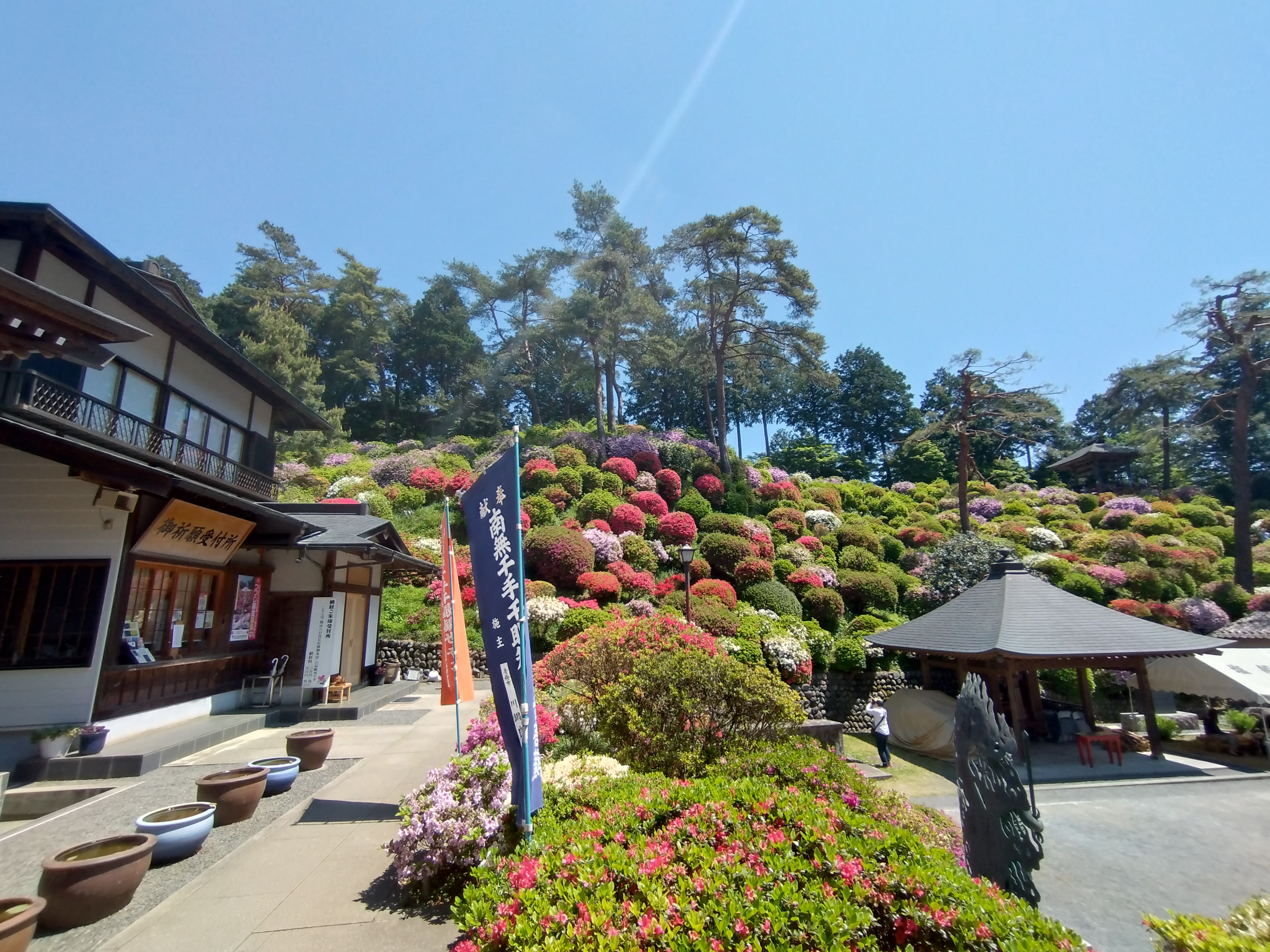 平成22年(2010年)に建立され、台座を含めた高さは約15メートルに達します 観音像は境内の最上部に位置し、周囲を彩るつつじ園を見下ろすように立っています。 とても迫力があります。