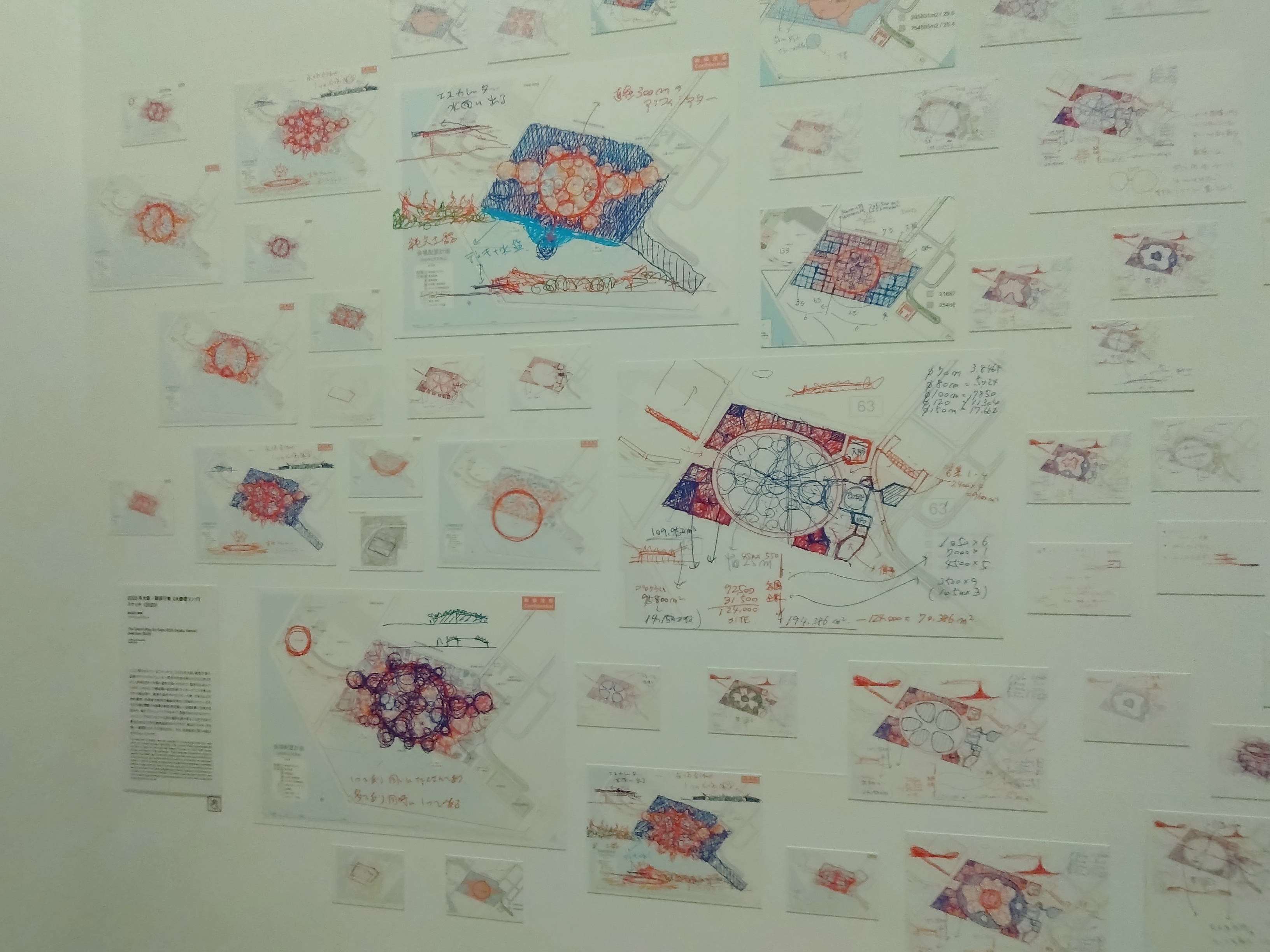 通り抜けた先の壁には、3?4カ月かけて描いた無数のスケッチを展示しています 構想段階における大屋根リングの藤本のスケッチは見ものです。締め切りに追われているのがわかります。。
